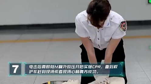 7、电击后,AED会再次分析心律,如未恢复有效灌注心律,操作者应继续进行5个周期心肺复苏(每个周期包括30次按压和2次人工呼吸),然后再次分析心律,除颤,心肺复苏,反复直至急救人员到来。