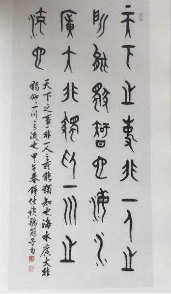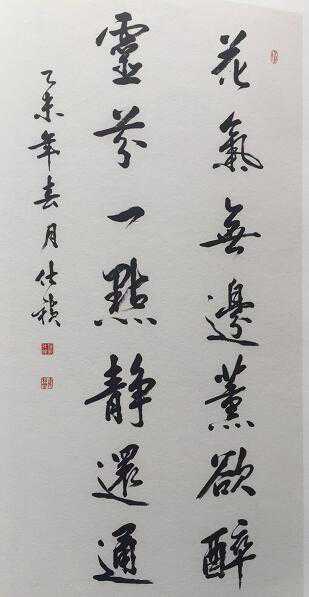 钟仕祯先致力于书道,功底雄厚。迄金文既有两周前之端庄肃穆,有得蒋维松先生风雅秀美之书风。他的行书,有的融楷入行,从结构到笔法,似楷非楷,似行非行,有楷之整一,亦有行之律动。有的是标准的行法,线条流畅,结构和谐,风清骨健,秀美挺拔,有一种清新高雅之气。