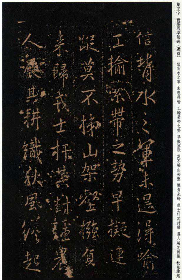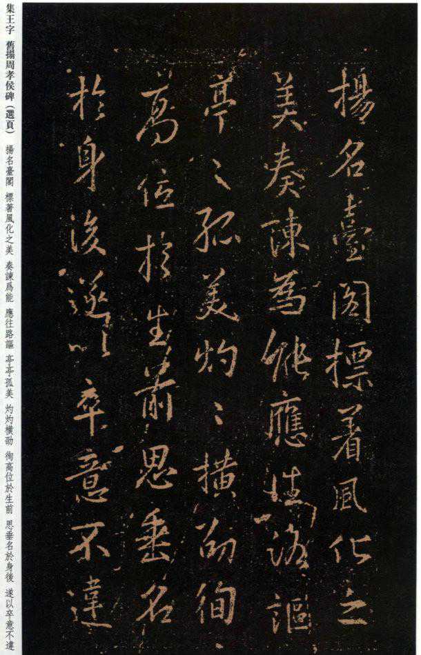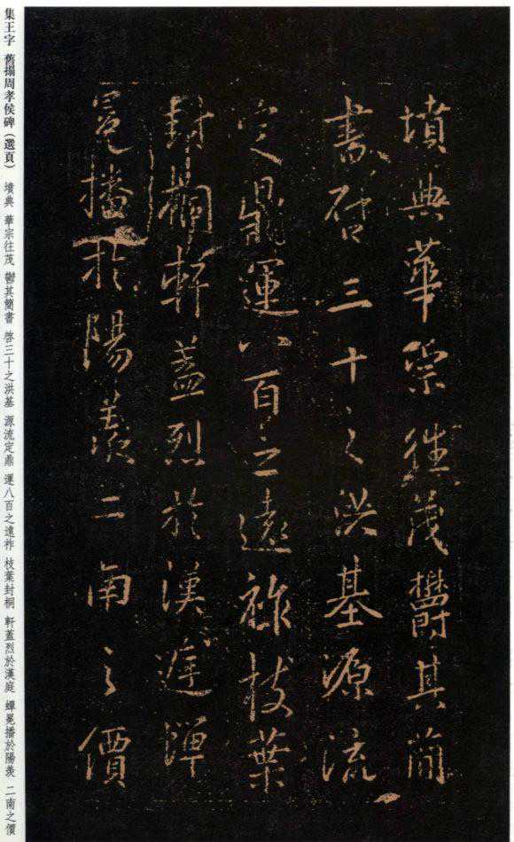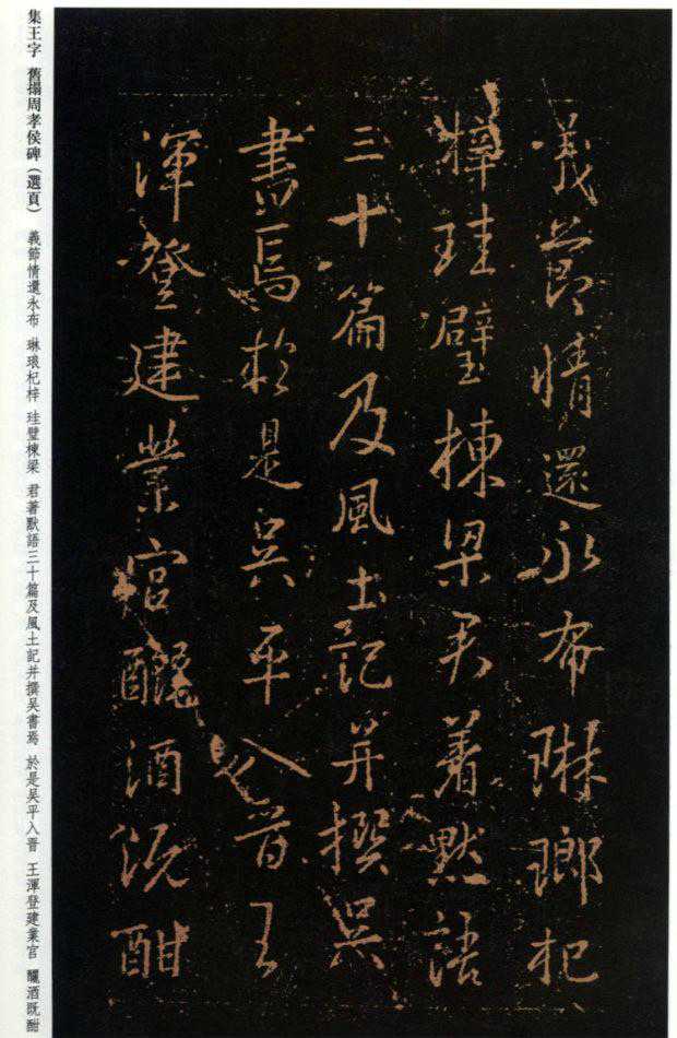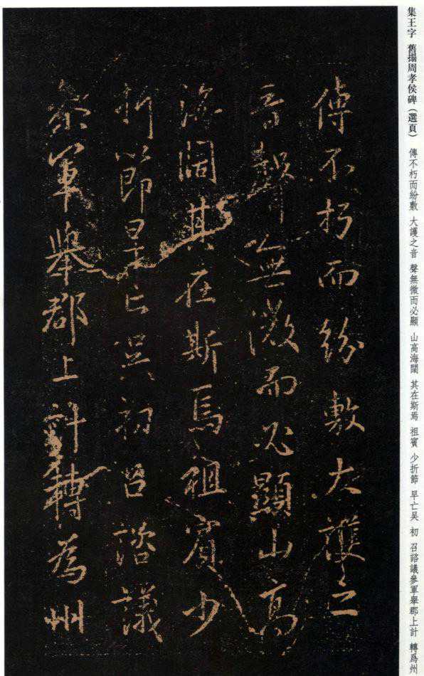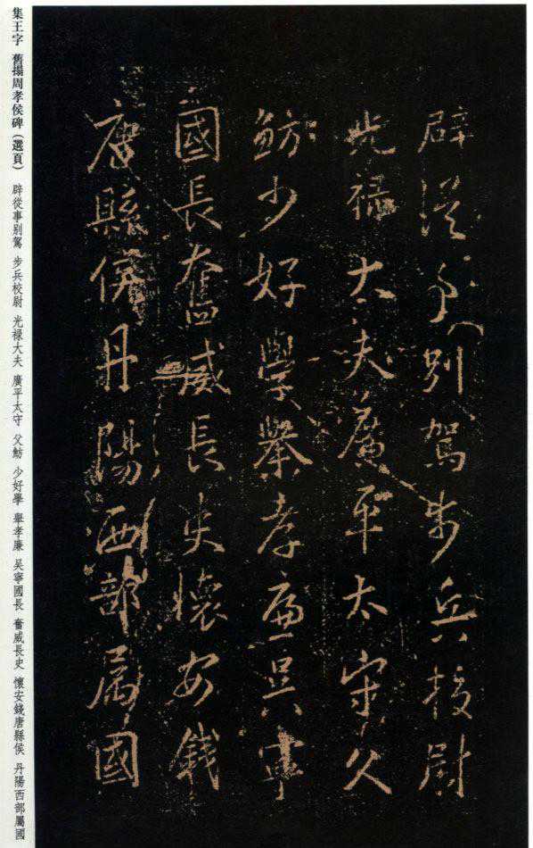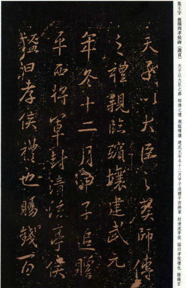 《平西将军周府君碑》现存江苏宜兴周孝侯庙,碑上题款标明由西晋文学家陆机撰文,集右军将军王羲之书,唐元和六年义兴县令陈从谏重立。据《宜兴县志》记载,明嘉靖年间,宜兴遇水灾,粮仓被淹,周王庙曾作粮仓。后因洪水泛滥,粮食腐烂,蒸蚀了石碑,字多漫漶,可辨识字仅三分之二。此旧拓本所有字迹清晰可辨,故可知其所拓时间至少早于明嘉靖,可称为此碑拓的最善本。