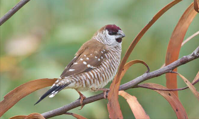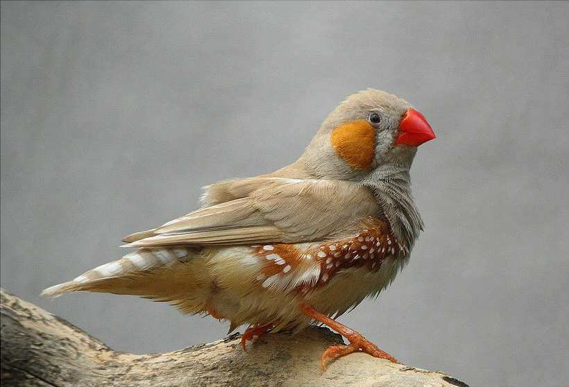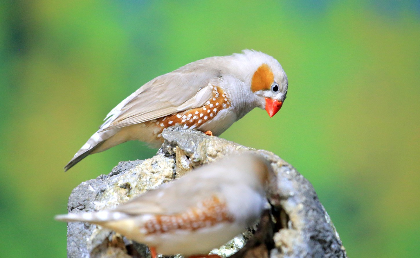 斑胸草雀又名金山珍珠,胸和尾羽有黑白斑纹,雄鸟胁部棕红色有白色点斑,除原色种外羽色全白的亦较常见。