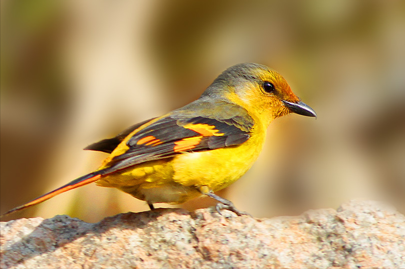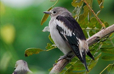山椒鸟类:包括山椒鸟和鹃鵙[jú]、林鵙[jú]等。体型较纤细;嘴短而基部稍宽,尖端弧曲,上嘴先端微具缺刻,鼻孔被疏羽,翅中等,较伯劳稍尖长;初级飞羽10枚,尾圆或平型,细长,尾羽12枚I跗蹀短细,前缘被盾状鳞。腿较短弱,适于树栖。体羽松软,腰羽羽干竖硬。代表种赤红山椒鸟、大鹃鵙