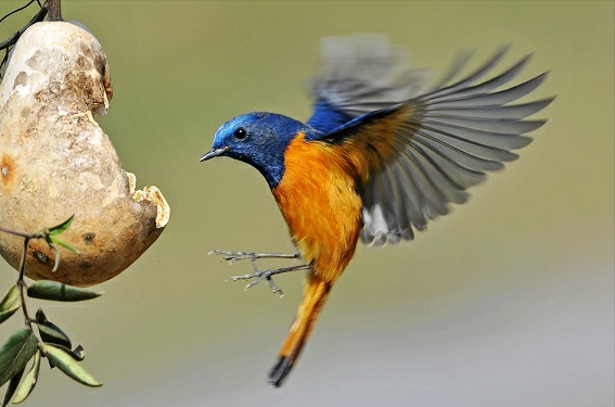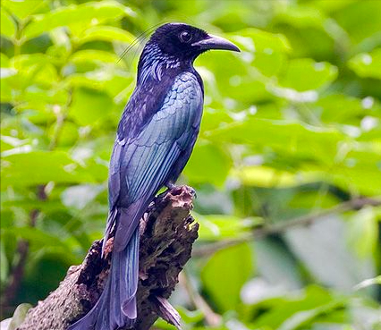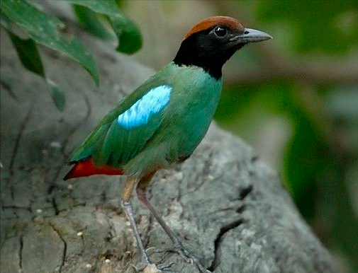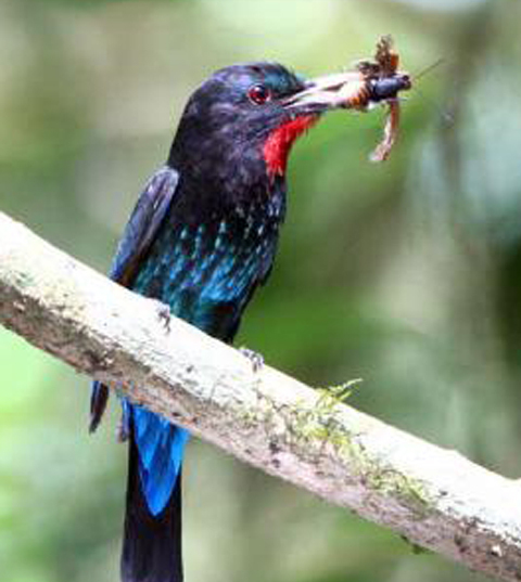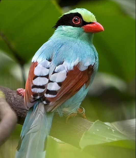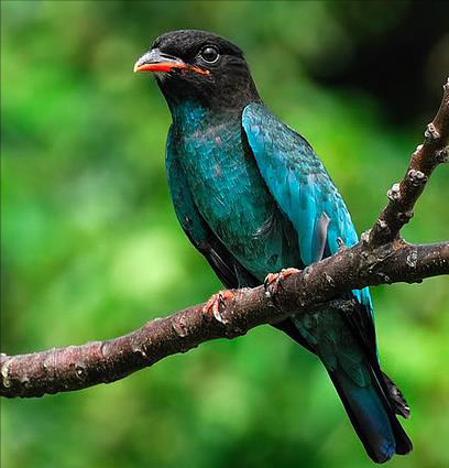 三宝鸟属于佛法僧目、佛法僧科,通体蓝绿色,头和翅较暗,呈黑褐色,初级飞羽基部具淡蓝色斑,飞翔时甚明显。