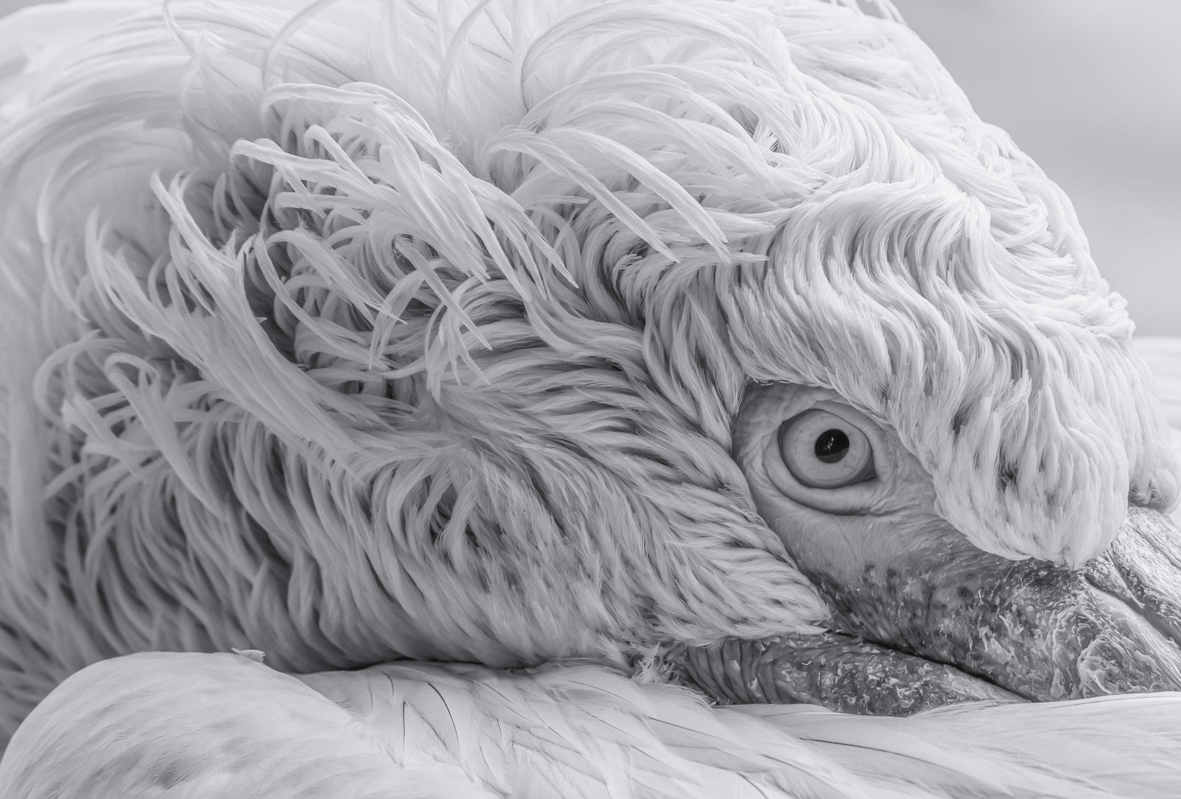 雪鸮属于体形较大的鸮类,体长约为50-71厘米,通体几乎纯白色,体羽端部近黑色,雪鸮头圆而小,面盘不显著,无其他鸮类常见的耳状羽簇,嘴基长满刚毛样的须状羽,几乎遮住全嘴。