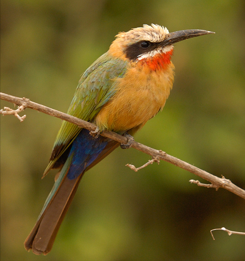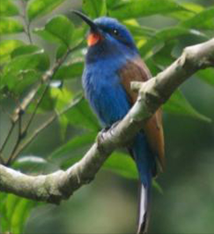 蓝喉三宝鸟喙黄色,头部与背部呈亮红铜色,喉部蓝色非常显眼,颈部与胸部与背部相同呈红铜色,尾部呈蓝色,腿黑色。