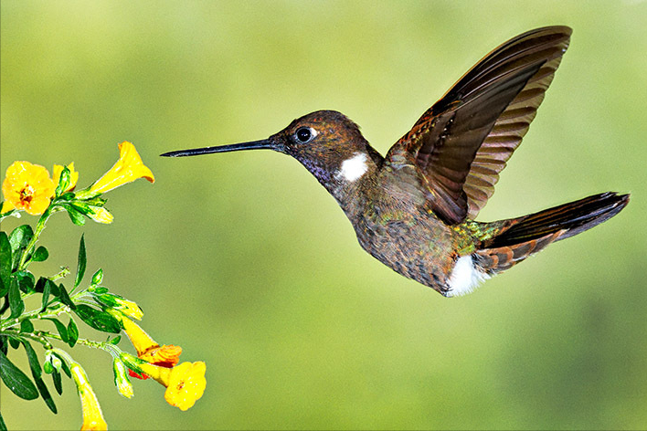 蜂鸟科因飞行时两翅振动发出嗡嗡声酷似蜜蜂而得名。全部产于美洲,主要生活在热带地区,在我国没有分布。蜂鸟科鸟类以体型极小而闻名,最小的是古巴的吸蜜蜂鸟,全长小于5.08cm,是世界上最小的鸟。该科鸟类翅扇动极快,频率特高,为50~70次/秒,翼高速震动产生特殊的嗡嗡声,常在空中悬停,也能向后飞行,这在鸟类中是少见的。