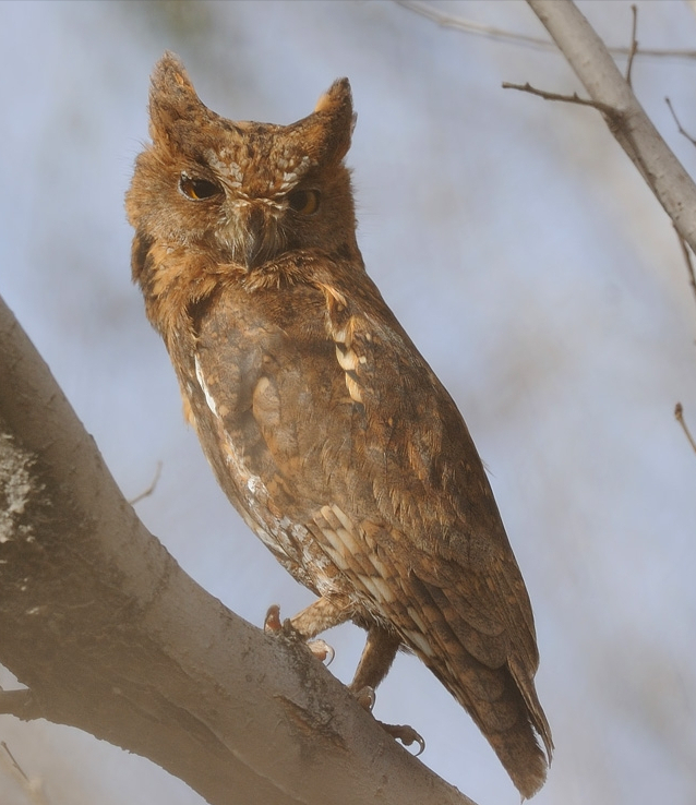 红角鸮全长约20厘米。上体灰褐色(有棕栗色),有黑褐色虫蠹状细纹。面盘灰褐色,密布纤细黑纹;领圈淡棕色;耳羽基部棕色;头顶至背和翅覆羽杂以棕白色斑。飞羽大部黑褐色,尾羽灰褐,尾下覆羽白色。下体大部红褐至灰褐色,有暗褐色纤细横斑和黑褐色羽干纹。嘴暗绿色,先端近黄色。爪灰褐色。