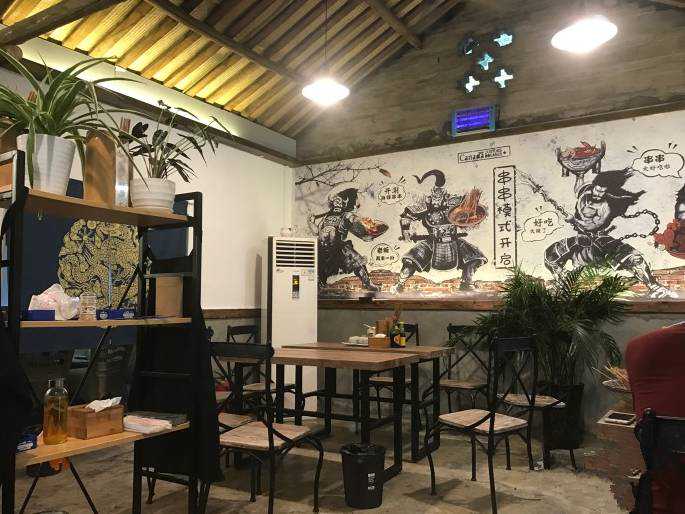 火爆成都的钢管厂串串,店内一律的红板凳,绿书架,墙上大幅大幅的彩绘都能让你恍惚一秒回到了那个70年代的钢管厂。
