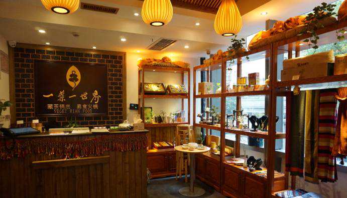 一叶一世界火锅,成都一家著名的素食火锅店,店内的物品陈设都很精致,朱红色的纱幔、木窗棂、雉叠的雅安藏茶,长几案、紫砂摆件…整个餐厅弥漫着浓浓的佛教气息。