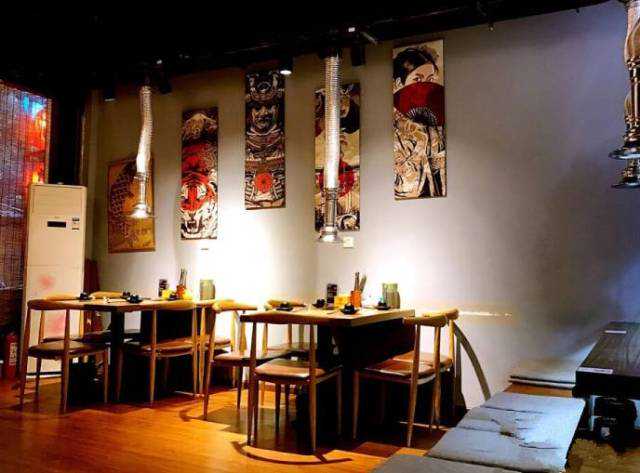 这是一家比较地道的和风日式烧肉小铺。原木色桌椅和榻榻米,日系风图案的小扇子和摆放整齐的日式烧酒瓶,氛围特别轻松愉悦。