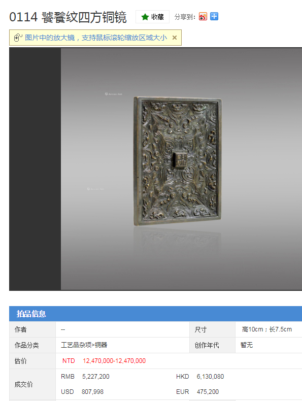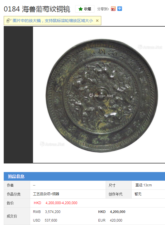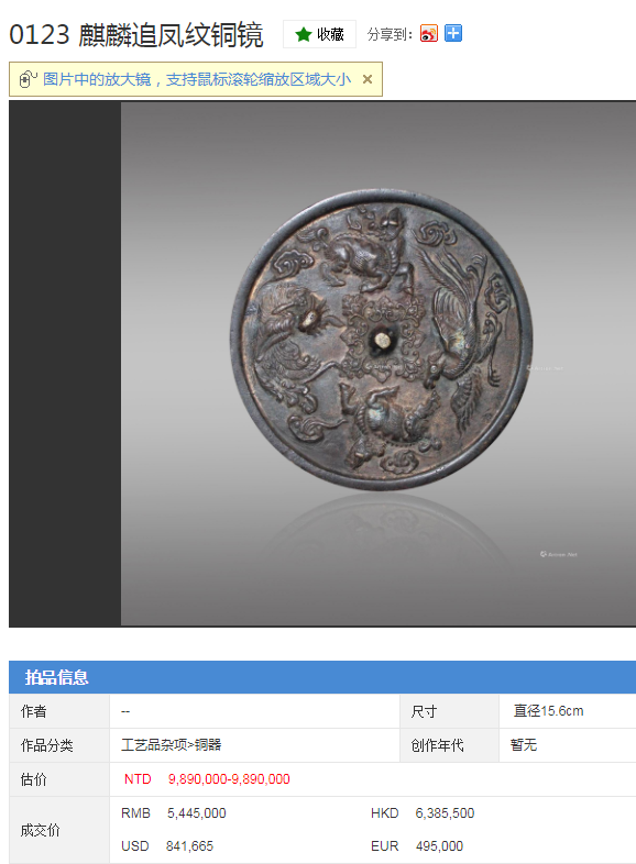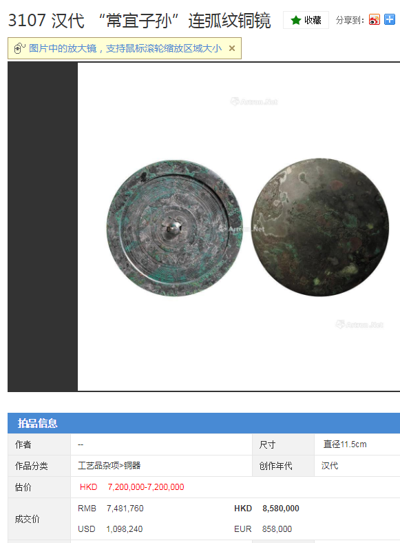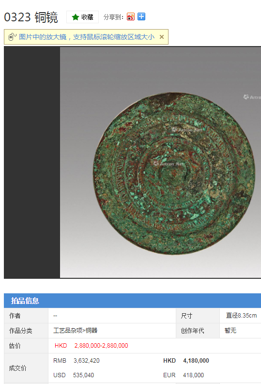 铜镜拍卖市场成交记录一览: