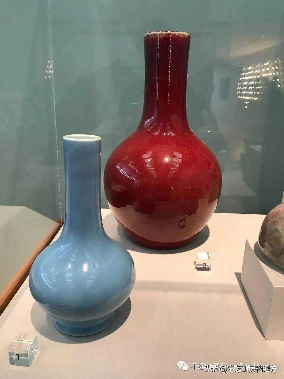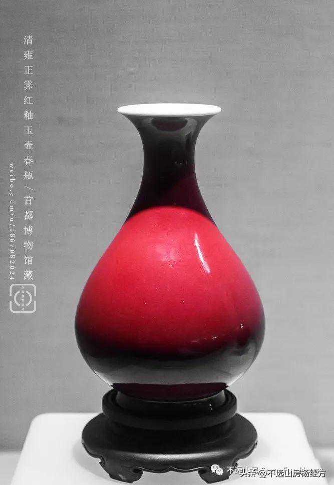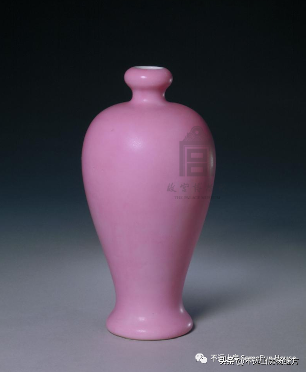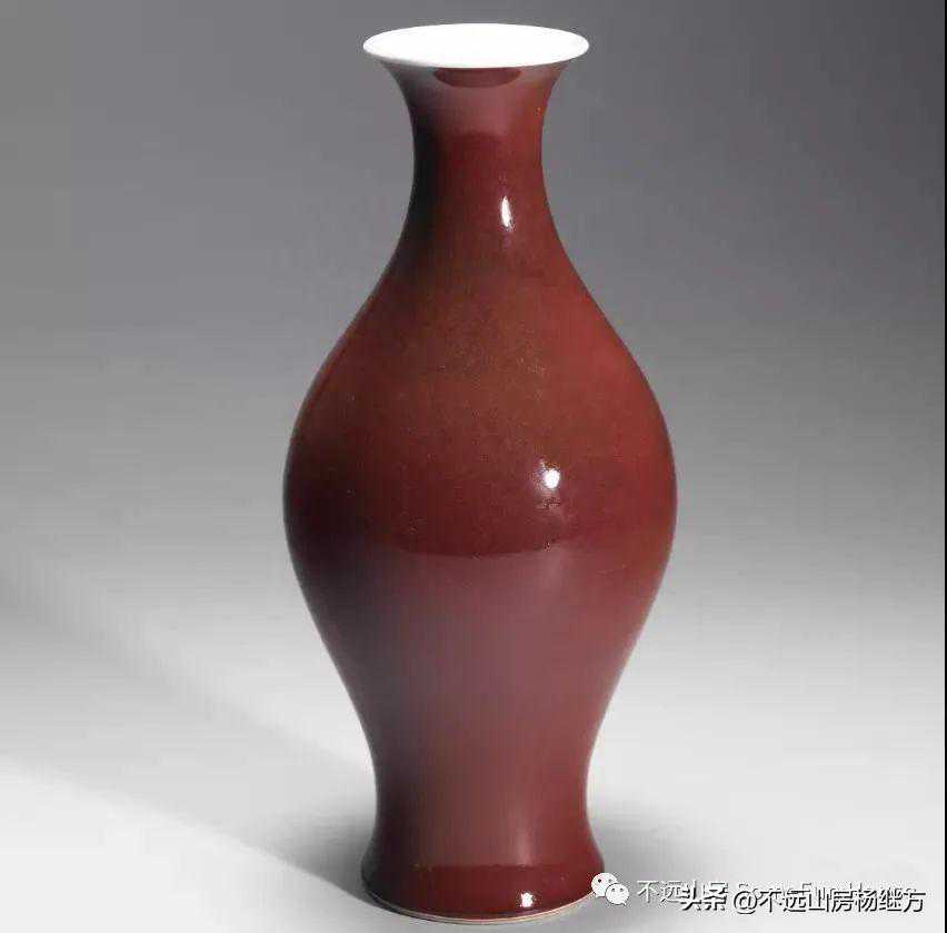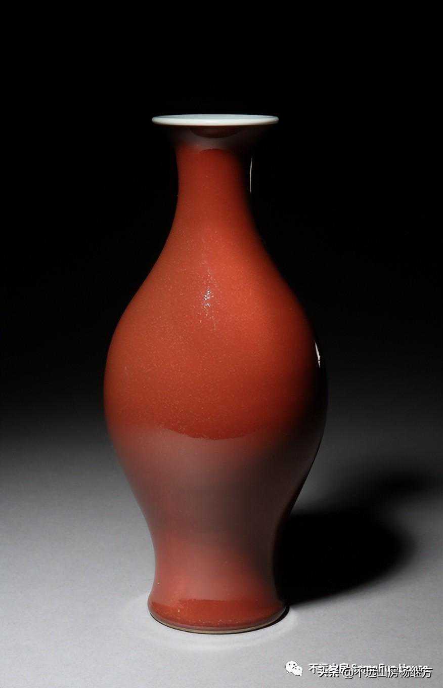 铁红釉,又称矾红、珊瑚红釉,是以氧化铁为呈色剂,在低温氧化气氛中烧成的一种微带橙黄的砖红色釉。雍正时的珊瑚红器釉层薄透而均匀,有明显桔皮纹色调沉着光润精美,呈现出富丽堂皇精致典雅的宫廷气象。珊瑚红釉是康熙时期创烧的低温彩釉,以铁为着色剂,因其釉色红中闪黄,色如红珊瑚而得名。此品颈部细长,器形秀美挺拔,如美人娉婷婀娜,全器满施珊瑚红釉,釉色细腻匀净,鲜艳纯美。《陶雅》谓之“华贵中之佚丽者也..匀净明艳,殆亡伦比。紫晶逊其鲜妍,玫瑰无其娇丽。”胭脂红虽然在康熙中早期就传入景德镇御窑厂,但是由于科技含量较高、造价较昂贵,直到康熙末期也没有被御厂普及使用。雍正中后期,由于御窑厂制瓷的发展革新,胭脂红逐渐推广使用至众多彩瓷领域。