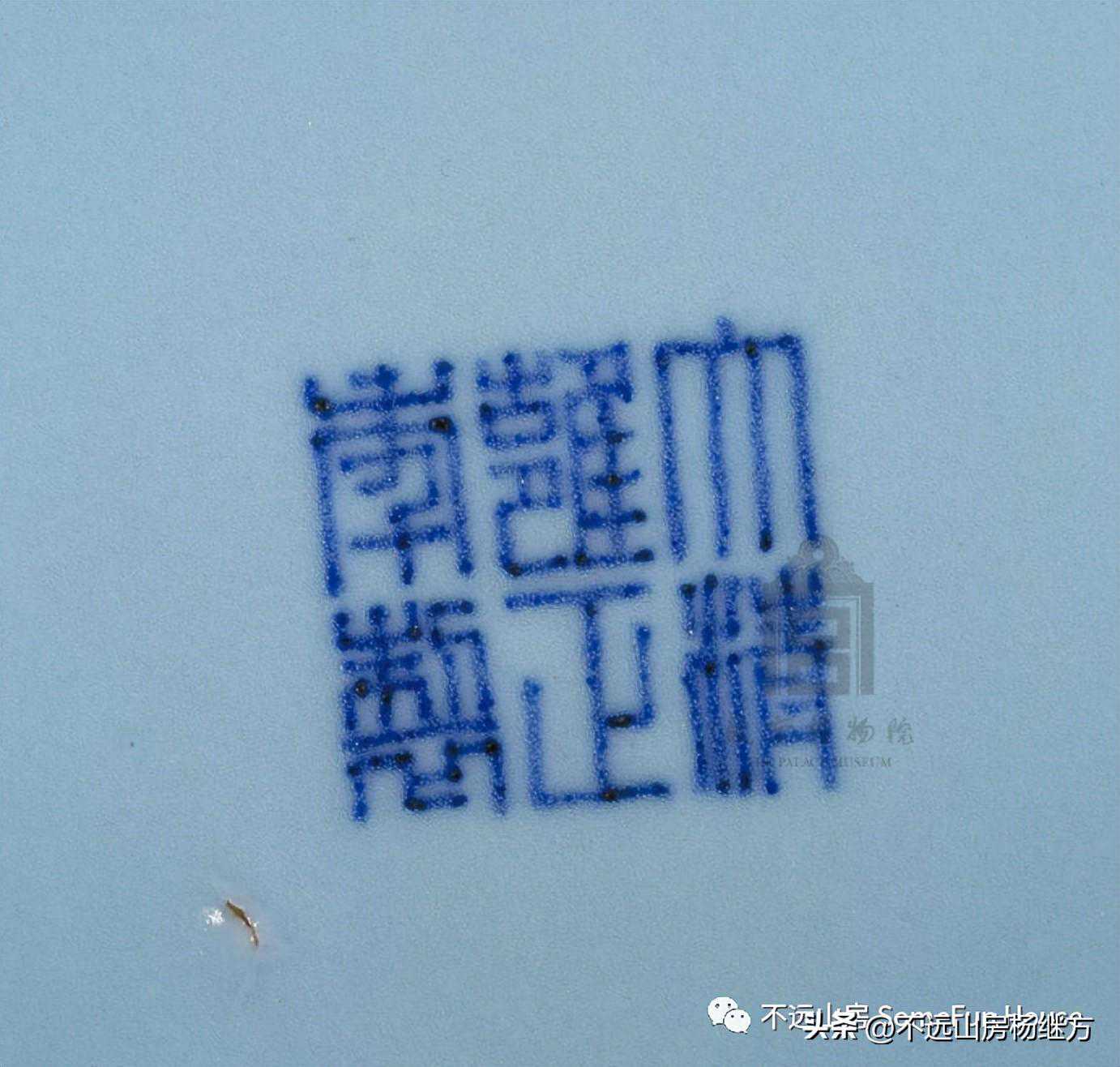 雍正皇帝十分喜爱瓷器,有些官窑瓷器的造型、纹饰、品种等都亲自审定御批,这在《清宫内务府造办处档案雍正记事杂录》中都有记载。如:“雍正七年八月初七日,郎中海望持出菊花瓣宜兴茶壶一件,奉旨:作木样交年希尧,照此款式作霁红、霁青釉色烧造。”雍正祭蓝,也叫霁青,是仿宣德宝石蓝釉烧制而成,这种失透、匀净、釉表布满橘皮棕眼的深兰釉,与祭红有相同特征,宁静肃穆,与天坛祈年殿上的琉璃瓦颜色一致,极适于天人相接的祭祀场所。雍正祭蓝釉有一些胎厚体重的巨大的盘、碗是典型的祭祀用瓷。