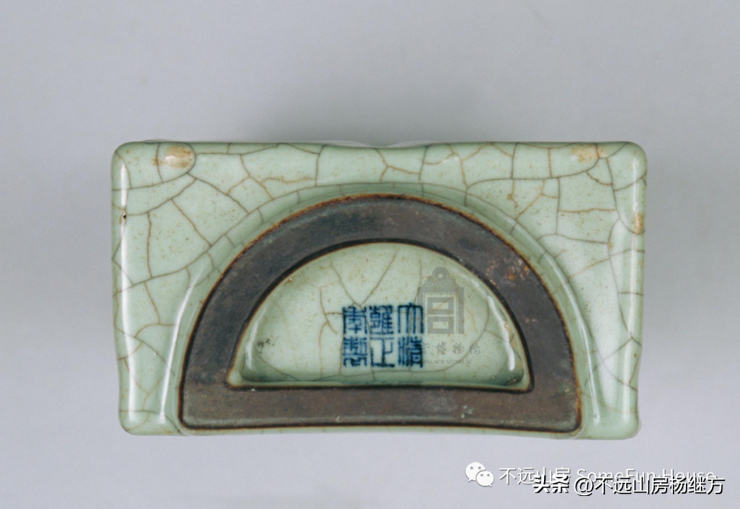 仿哥釉——旧称“铁骨哥釉”,有粉青、米色两种,造型比仿官、汝釉少,盘口瓶、双贯耳方瓶等与仿官、汝釉相同,另有新增的三孔穿带耳扁瓶、双耳四系瓶、乳钉石榴尊、双鱼耳香炉、笔山子、笔洗、水丞等文房小件器皿。釉色青中泛浅灰者居多,釉青有类似“金丝铁线”深浅交错的开片纹,多数制品圈足内暗刻六字篆书印章款,少数不带款识。