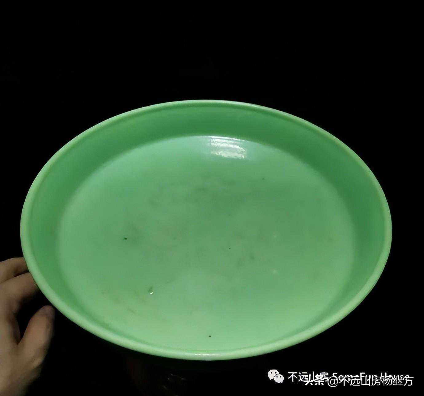 雍正时期在继承前代的铜绿釉的基础上,研制出掺进其它金属呈色剂的各种绿釉瓷器,不仅有一般的绿釉,还有鱼子绿、松石绿、瓜皮绿、湖水绿、葱绿、龟裙绿等新釉色。绿釉的精纯度也大大提高,色泽亮翠鲜艳,洁净透明。菊瓣盘中绿釉盘釉色浓绿发蓝,无纹片;葱绿釉盘釉色绿中闪黄,接近草绿色,如初芽之嫩葱,亮艳娇嫩:湖水绿釉盘色泽淡雅发天蓝,柔和如丝,滋润光亮。菊瓣盘中属于绿釉系列的有三件:绿釉菊瓣盘、葱绿釉菊瓣盘、湖绿釉菊瓣盘。