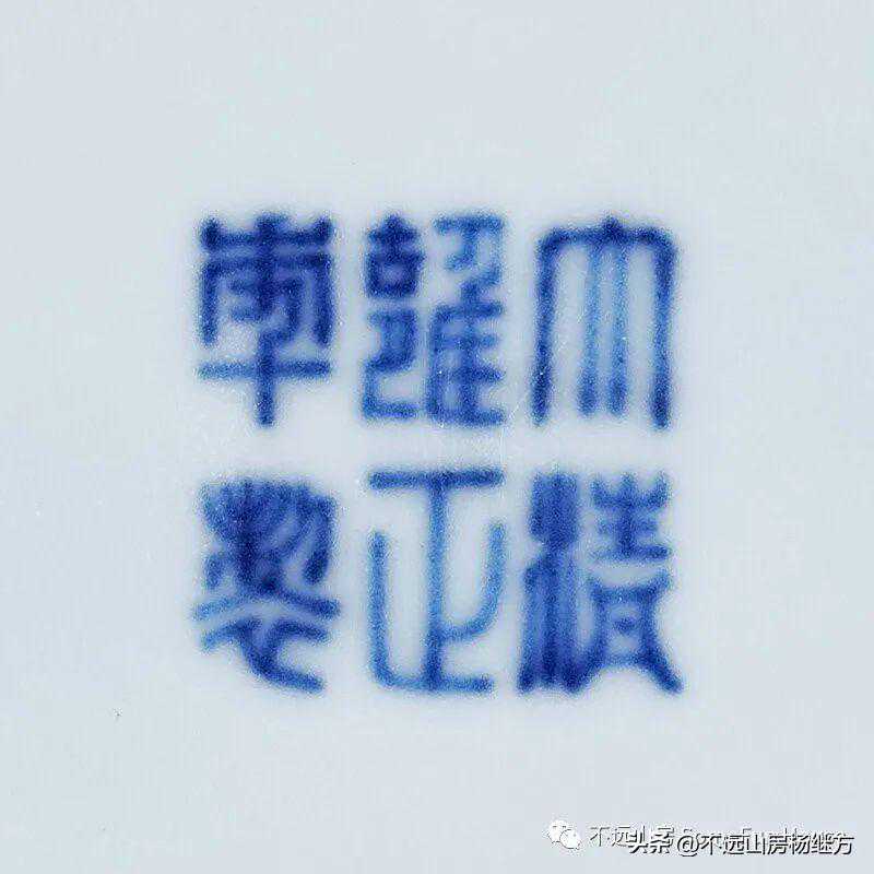 雍正祭蓝釉造型有玉壶春瓶、胆式瓶、穿带瓶、折肩撇口瓶、圆洗、盆奁、茶壶、盖钵、高足豆、高足碗、大碗、盘、碟等,釉深浓沉静,厚而均匀,有里外蓝釉与里白外蓝两种,底均有青花六字双圈六字楷书“大清雍正年制”。