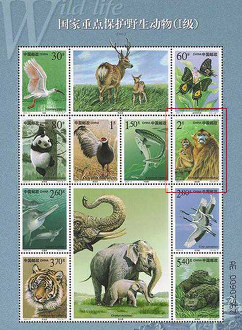 2000年2月25日,中国邮政发行2000-3《国家重点保护野生动物(I级)(一)》特种邮票,全套10邮票,第6图为《金丝猴》(图6),从图案看是2只川金丝猴。