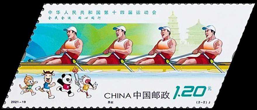 中华人民共和国第十四届运动会于2021年9月15日至27日在陕西省举行,中国邮政于开幕日发行2021-19《中华人民共和国第十四届运动会》纪念邮票,全套2枚邮票,第2枚《赛艇》邮票图案(图7)下方是4个吉祥物,吉祥物分别以生活在陕西秦岭的4个珍贵动物“朱鹮、大熊猫、羚牛和金丝猴”为创意原型。排在最后面的是吉祥物“金金”,其原型是秦岭金丝猴为川金丝猴亚种。