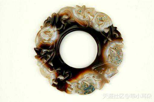 玛瑙璧上的夔龙纹更是运用透雕的手法,与天然的纹饰自然融为一体,用“巧夺天工”来形容亦不为过。仔细看这块玛瑙璧,不仅质地显得很温润,而且还给人一种半透明的感觉,如果不仔细看的话很可能会被错认为是玉质的。