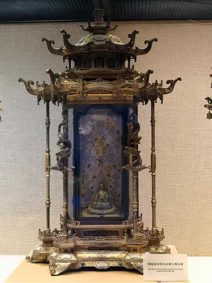 龛是指专门供放神位、佛像的小阁子。古人喜欢把金镶玉视为非常珍贵的宝物,而这件盛放神像的龛既雕上了代表崇高地位的龙,又镶上了代表美德的玉石,可以看出教徒对宗喀巴这位大师的敬重之心。