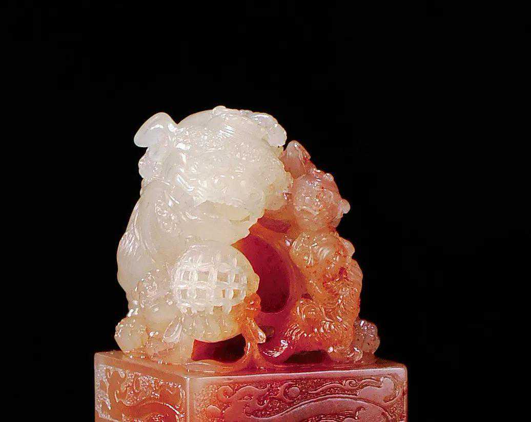 除此之外,这个时期的狮子钮,有一些在躯体也受到清代中晚期的雕狮时风之影响,大多身披重毛,一绺一绺,酷似舞狮时候南狮之造型。今年东南秋拍上的一枚冰糖地三狮钮荔枝印章,其工艺即是这一风格的余音。