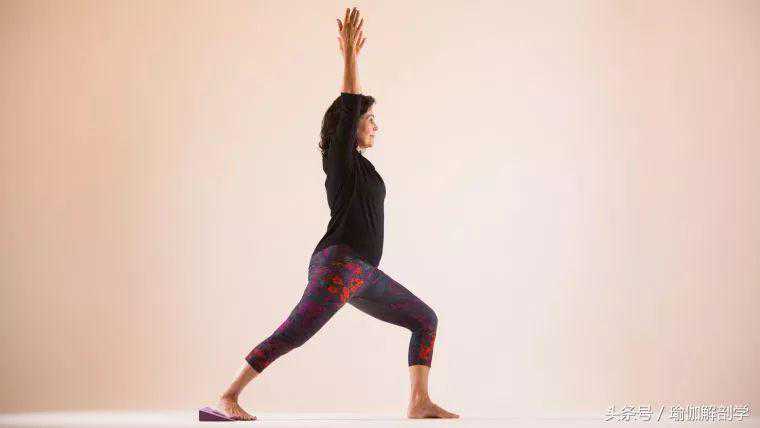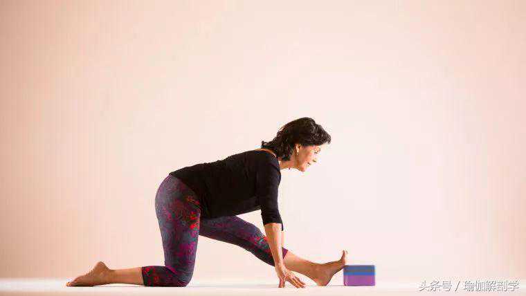 转左脚90度,脚掌踩瑜伽砖