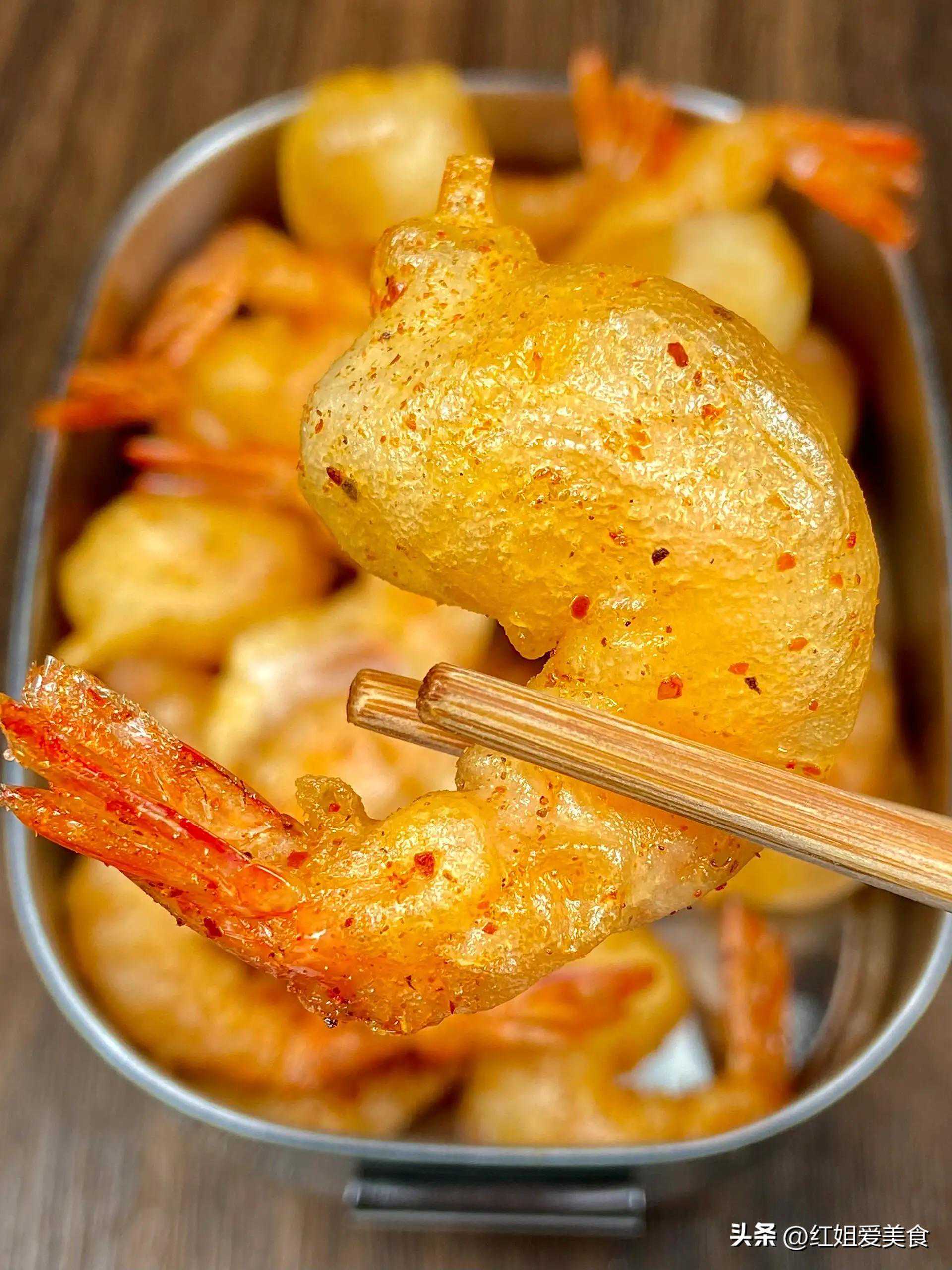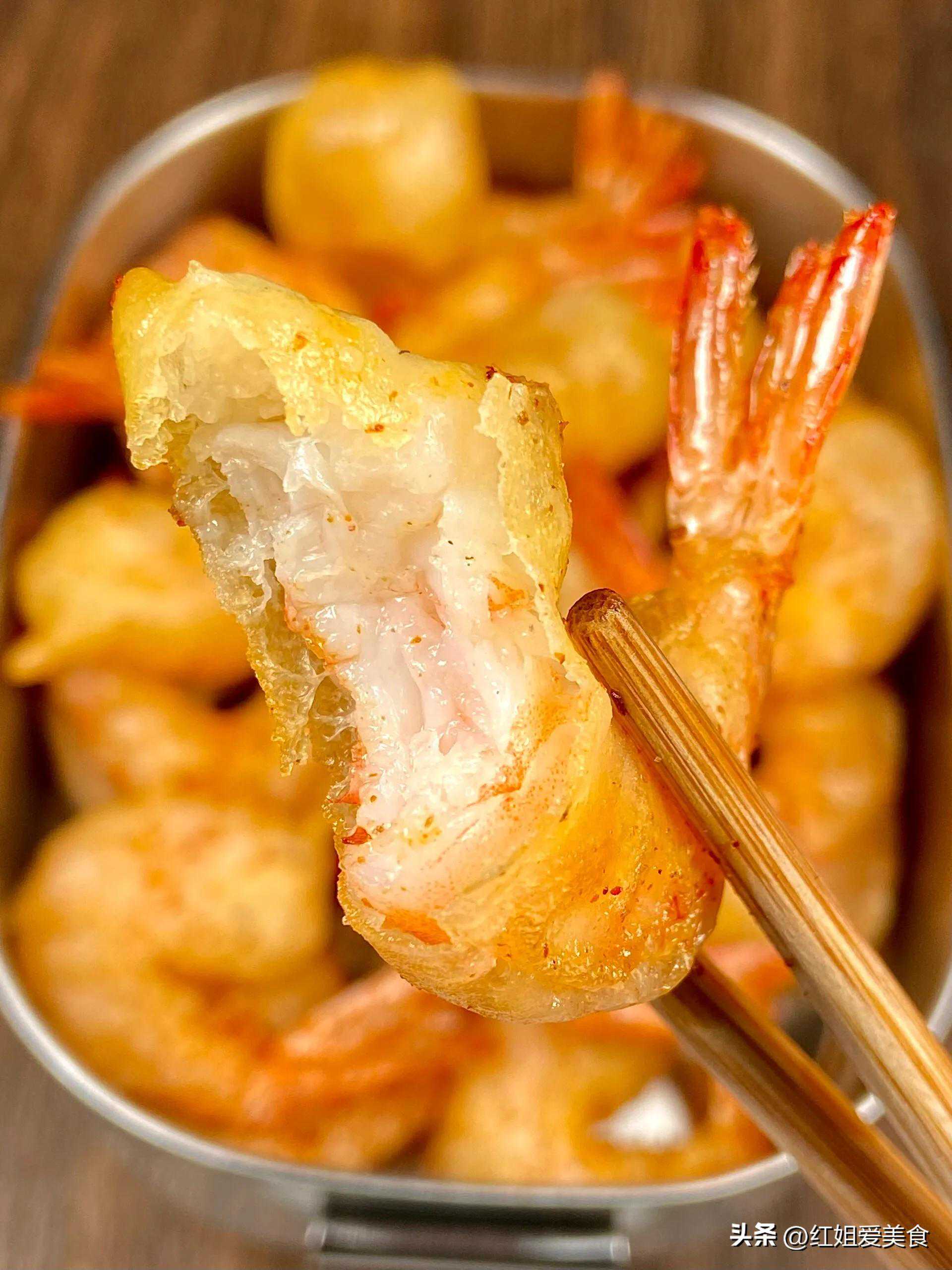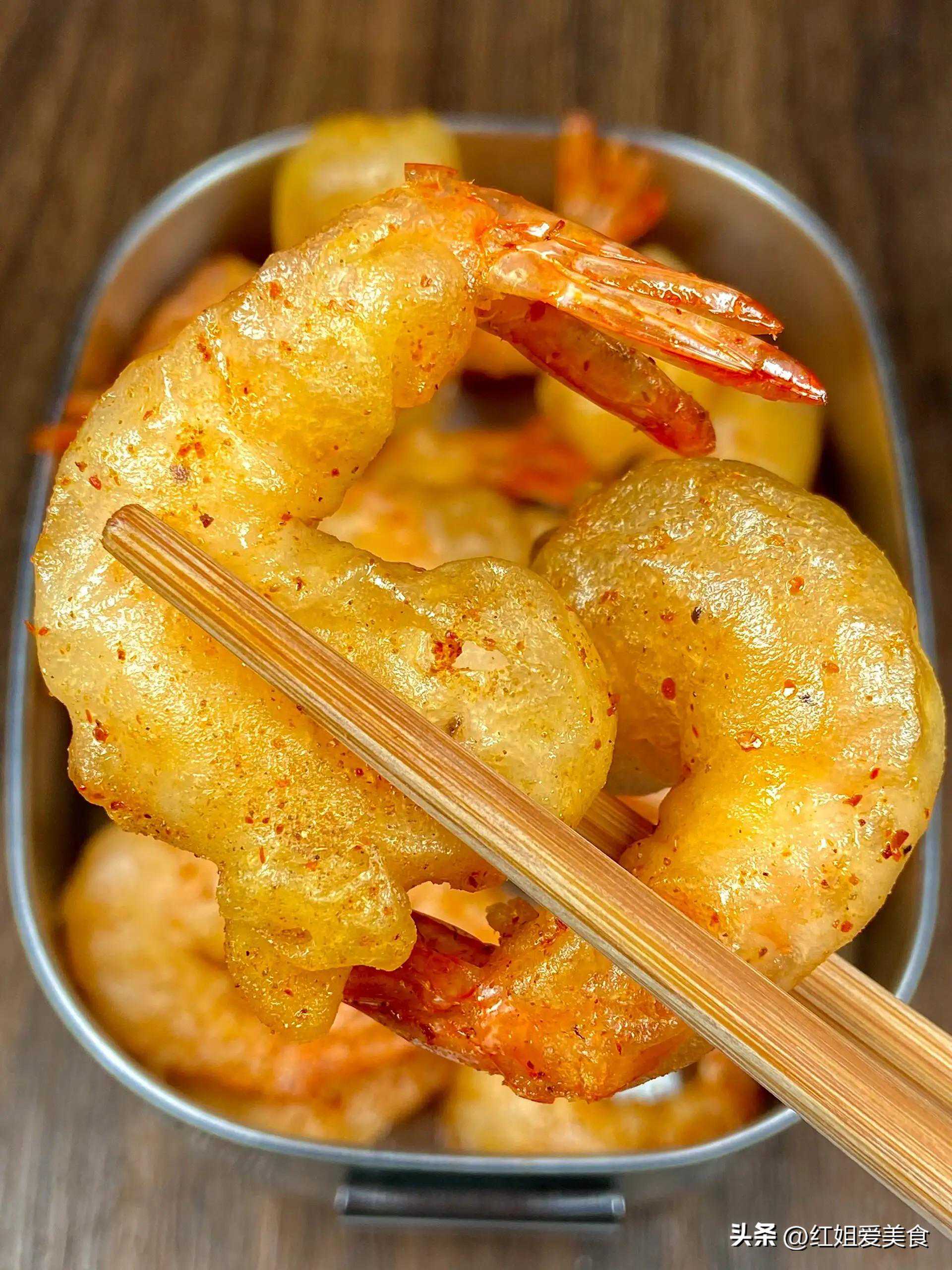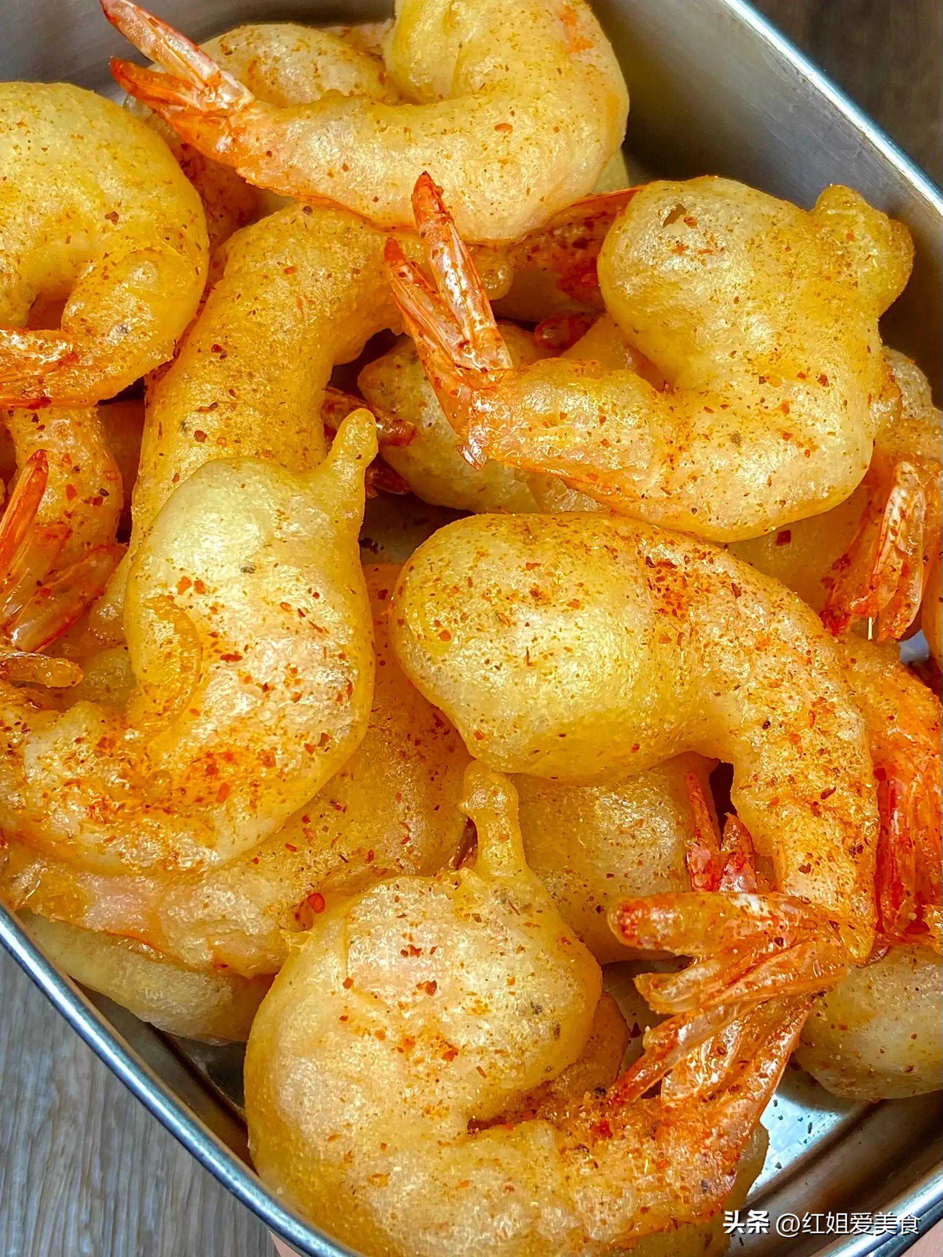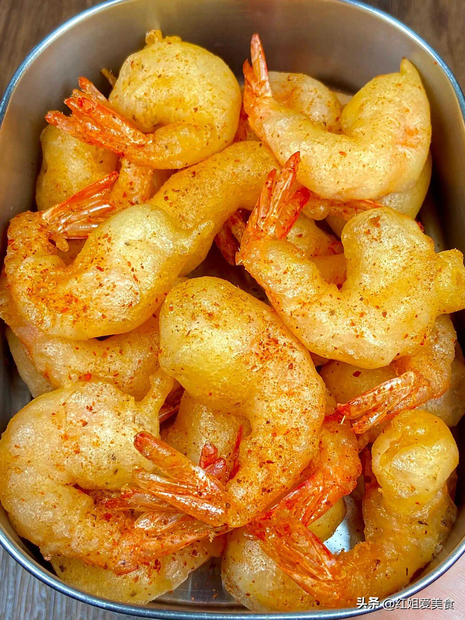 选用新鲜的大虾,先经过剪去虾须、虾壳的处理,再裹上混合了盐、胡椒粉等调料的粉末,放入热油中炸至金黄酥脆。