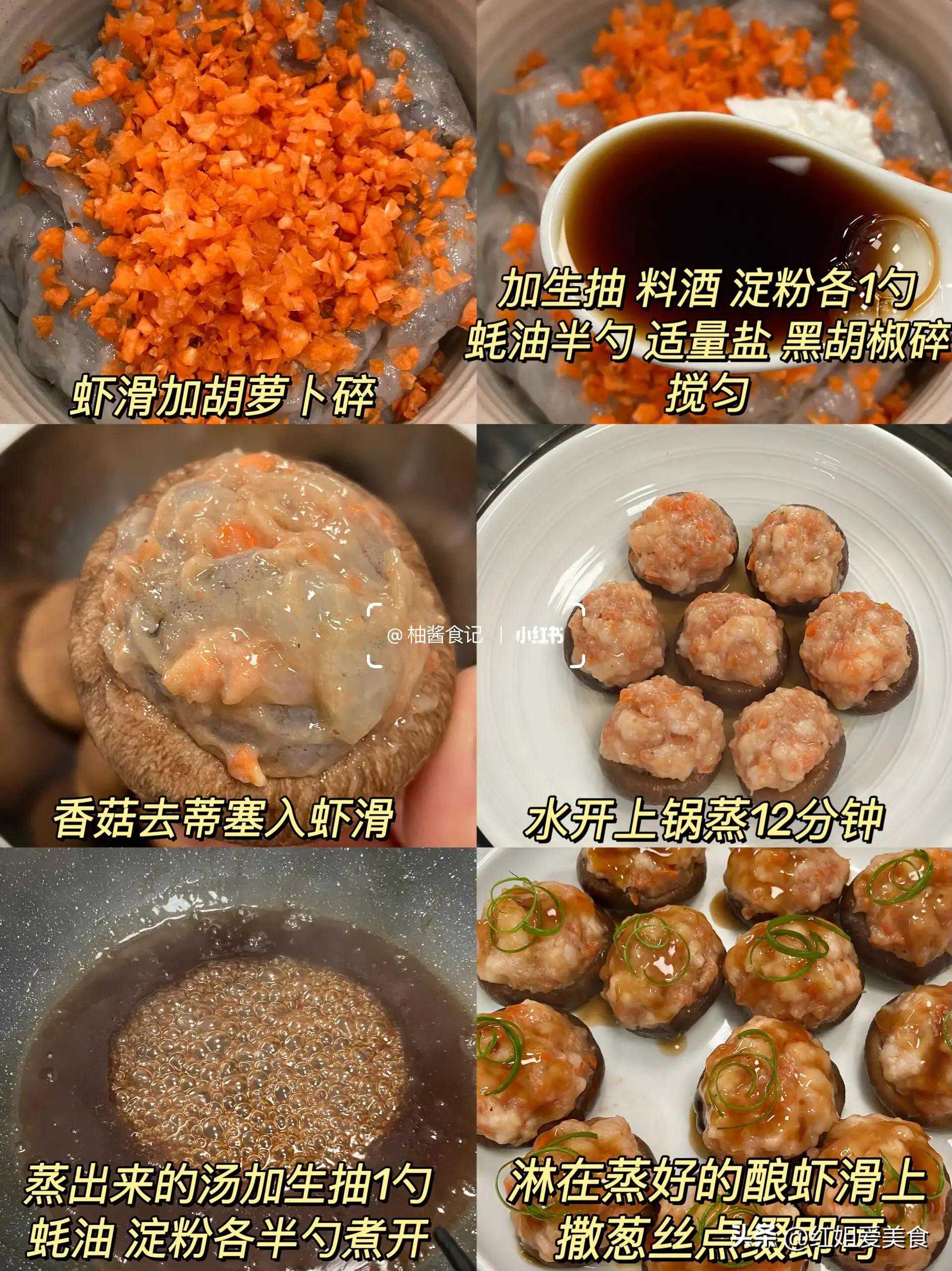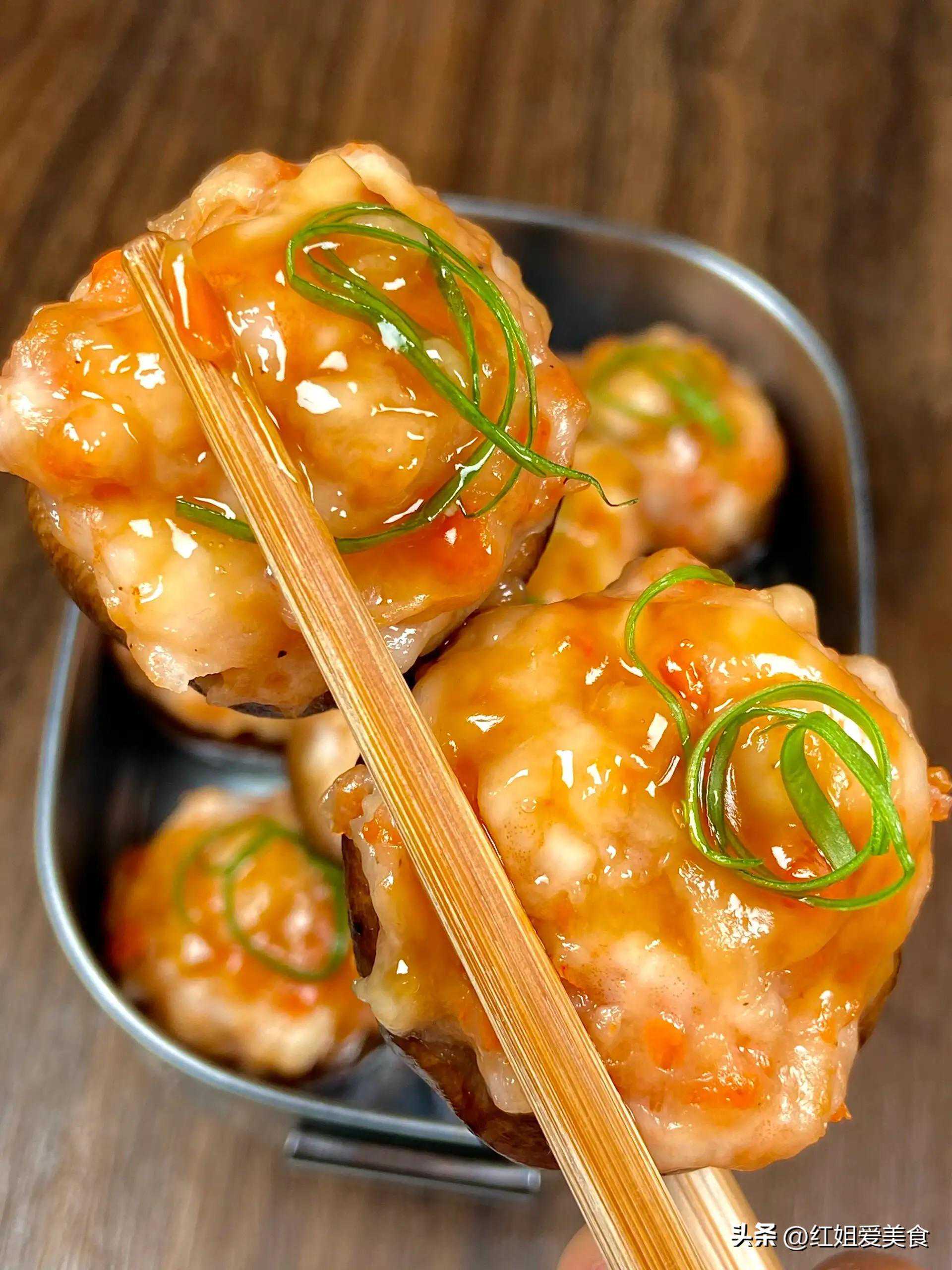 将新鲜的虾肉捣成泥,再搭配香菇制成酿料,将酿料填充在香菇上,然后蒸熟或煎熟,使虾滑与香菇完美结合,既饱含虾肉的鲜香,又有香菇的咸鲜味道。