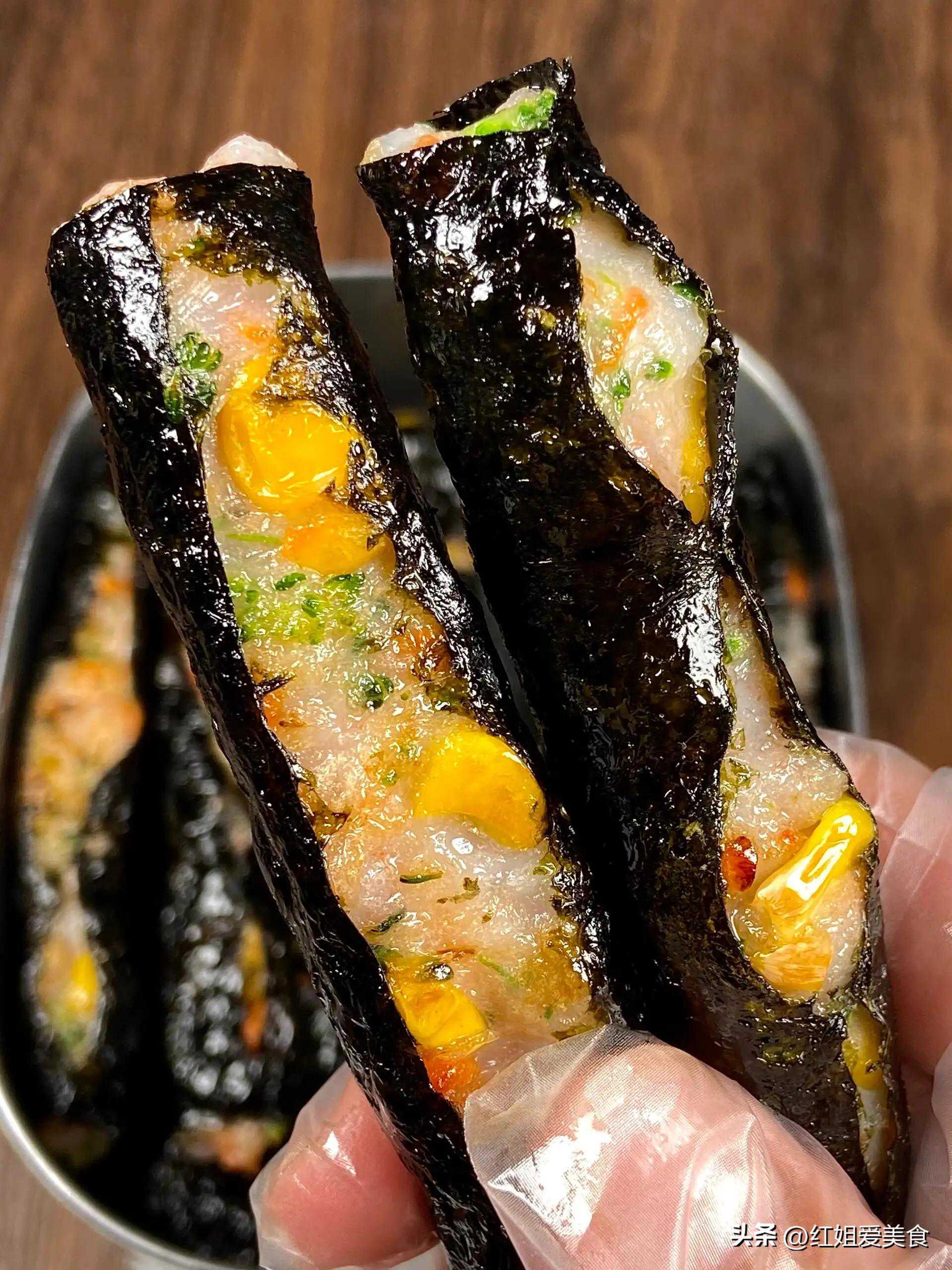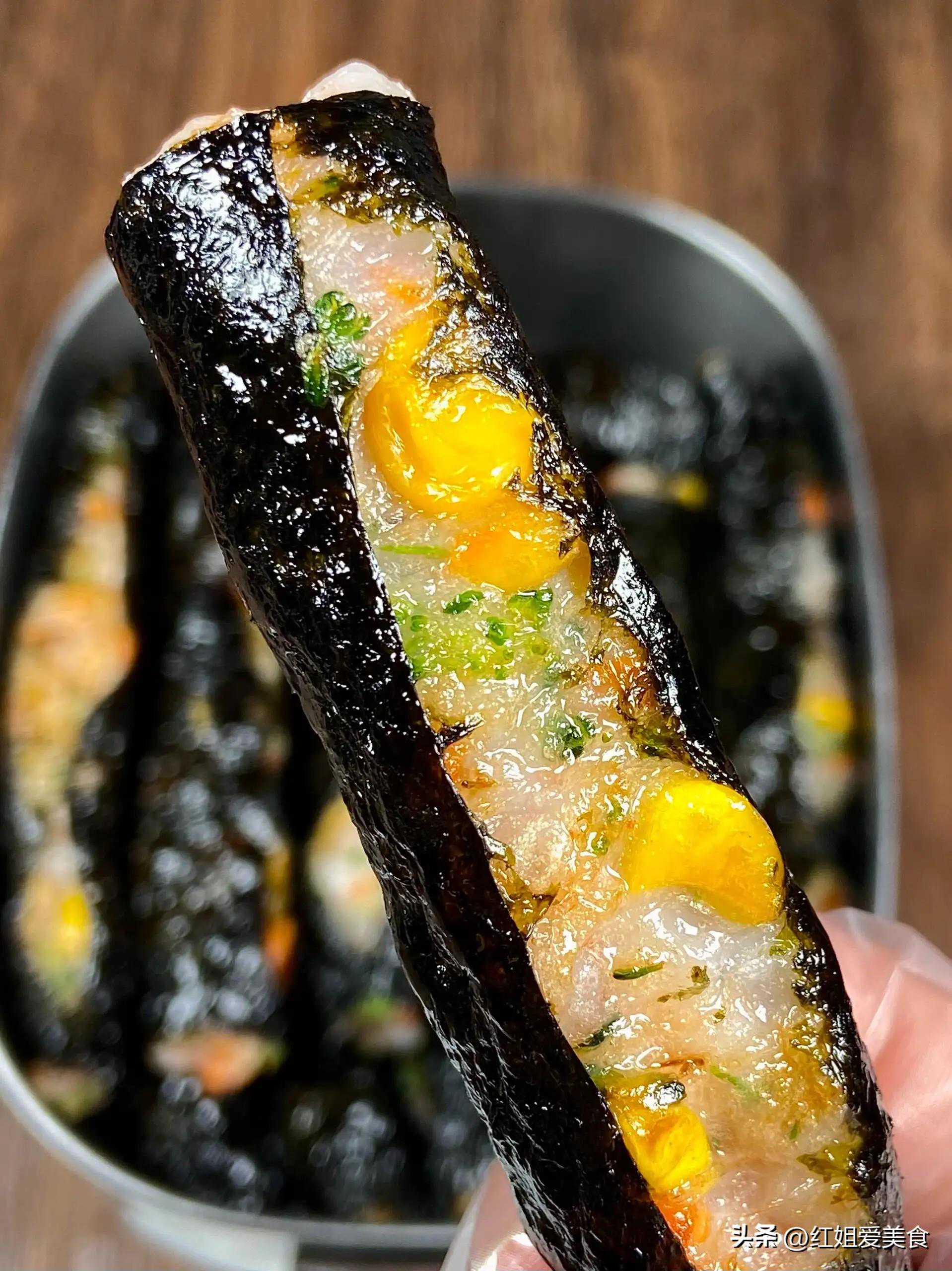 这道菜以海苔为外包,内夹玉米、胡萝卜和虾滑等多种食材,是一道营养搭配丰富的中式小吃。