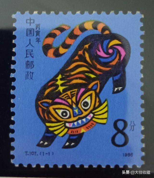 1986年生肖虎,发行量12663万枚,面值8分,市场价格单枚约4元左右。
