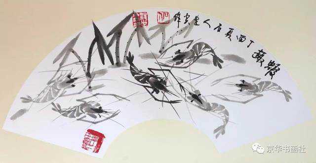 汪世炎画中的虾悠然自得,无拘无束,不问王与侯,不听龙怒庭,不畏权势,不逐名利,脚踏实地。观其运笔,虾头一笔重墨,虾眼横出两笔,用笔流利,技法已趋精熟。
