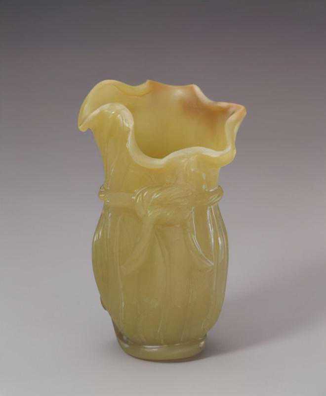 黄玉荷叶式花插,清,高14.5cm,宽9cm,厚5.5cm。