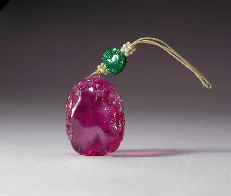 桃红碧玺瓜式佩,清,长3.5cm,宽4.5cm,厚1.1cm。