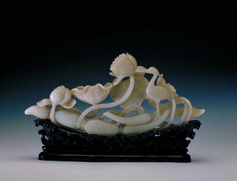 以圆雕、镂雕技法雕琢青玉鹭鸶、藕节、莲花、莲蓬和莲叶。