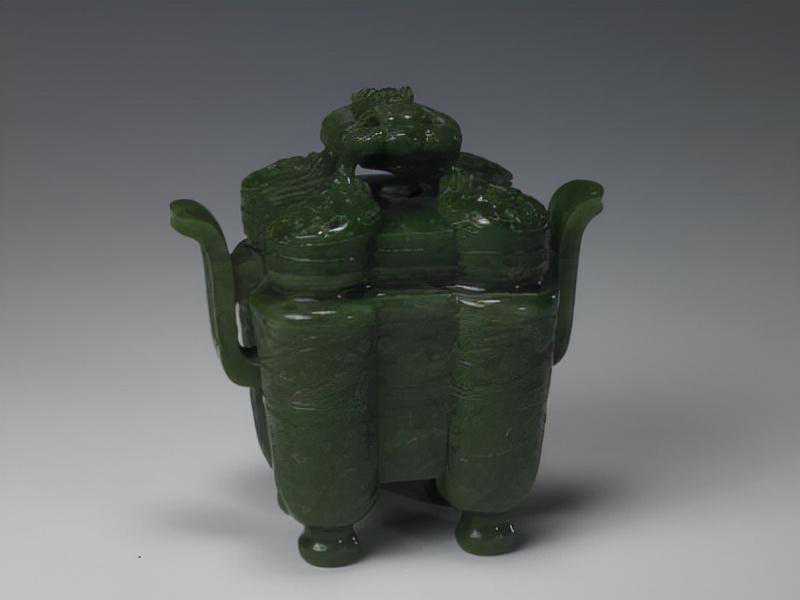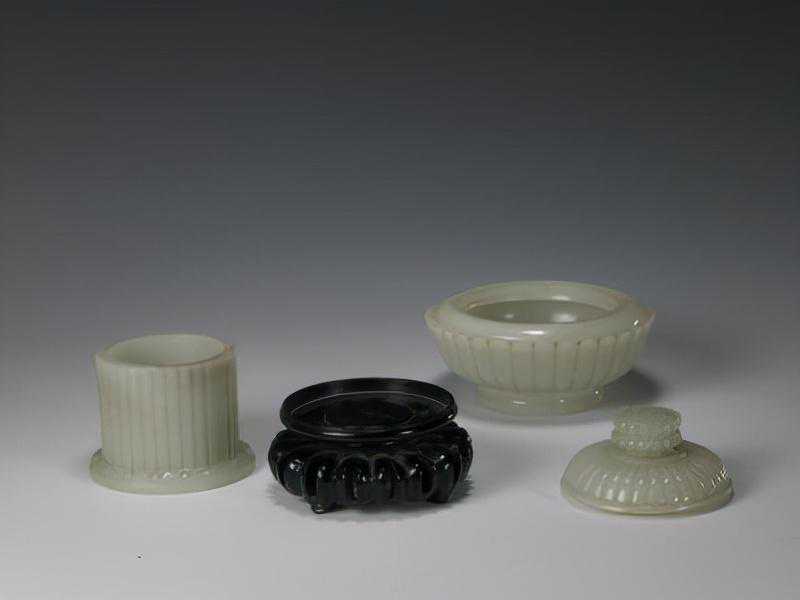 碧玉四柱式炉、瓶、盒三式,清。炉通高11cm,通宽11.1cm,炉方径7.3cm;瓶通高11cm,最宽2.2cm,厚2cm;盒高3.8cm,边长5.8×5.3cm。
