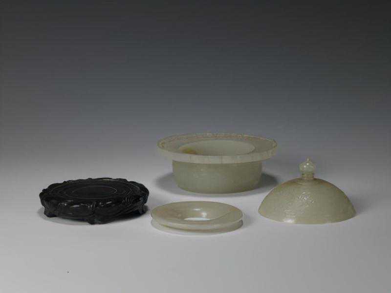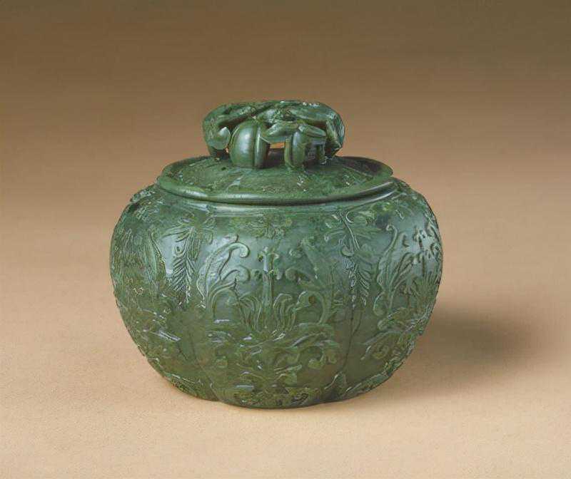 碧玉镂雕牡丹纹盒,清,通高9.1cm,最大口径20.4cm。