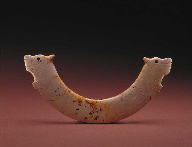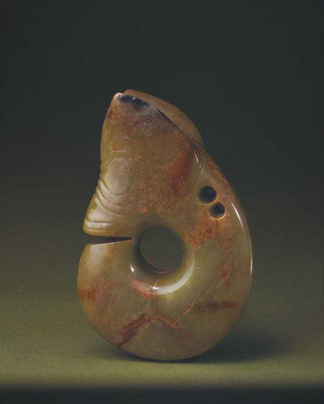 红山文化分布于我国东北地区,在其遗址中发现了较多的玉器,其中有一定数量的玉鸟,多为鹰类。常见的玉鹰有二类,一类近似方形,翅的边缘平直;另一类鹰的翅膀大且展开,似飞翔状。这件玉鹰属后一类,辽宁省阜新市胡头沟遗址出土有同样的作品。此玉鹰的造型较接近于现实,鹰的腹面加工精致而背部简练,系因人们仰望飞鹰所得的观察结果。