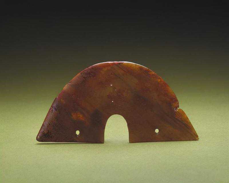 玉兽面纹嵌饰,高3.2cm,宽4.8cm,厚0.7cm。新石器时代良渚文化。