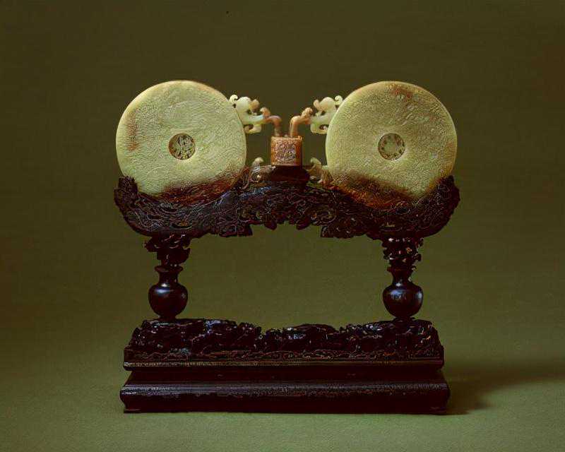 黄玉双联璧,清,璧径13.7cm,通长35.6cm,中部厚2.7cm。
