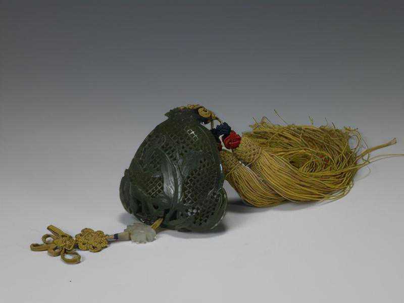碧玉镂雕石榴式香囊,清,长5.1cm,宽4.7cm。