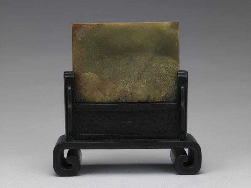 孔雀石山水人物插屏,清,高13.6cm,宽8.5cm,厚2cm。