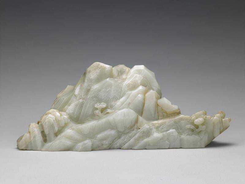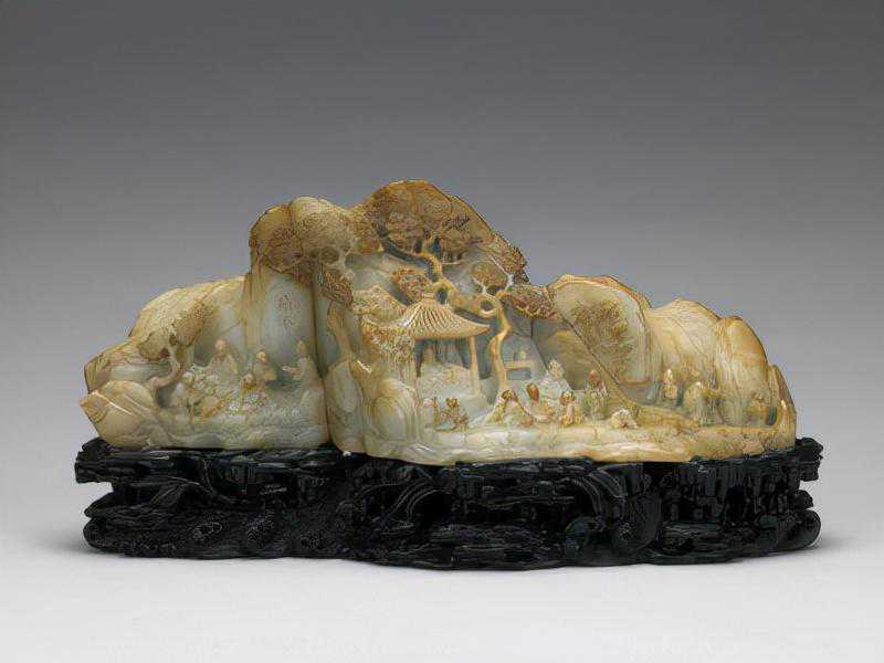 玉器表面琢碾带有叙事性和图画性装饰图案的做法,始于宋代。明代玉图画更为盛行,多将山水、人物、花鸟、典故、诗文意境移植到玉质器皿的表面作通景式的表达,但这种表现多是平面的。玉山子作为室内陈设之一,在清代十分流行,既有硕大无朋重达万斤的大禹治水图山子,也有精巧雅致可收纳于百事件中者,大小适中的案头陈设山子更是不胜枚举。玉山子多取材绘画、诗文、历史故事,精心布局,立体展示,有的更镌刻诗文、印章,成为集诗、书、画、印于一体的极富文人雅趣的三维雕刻艺术。