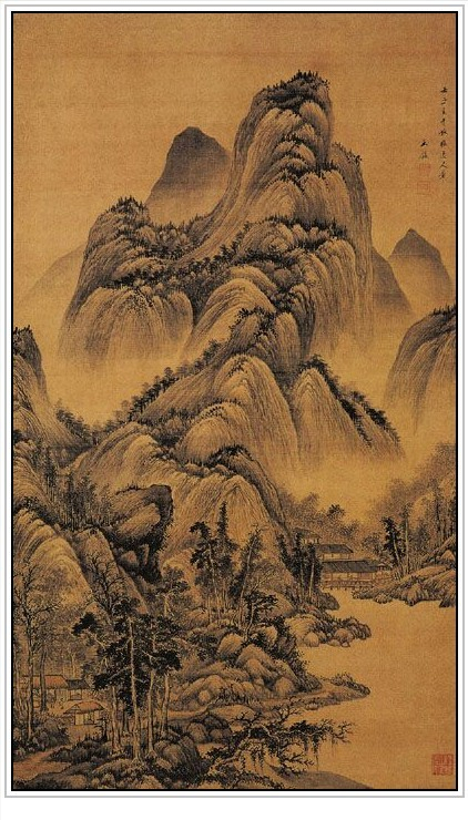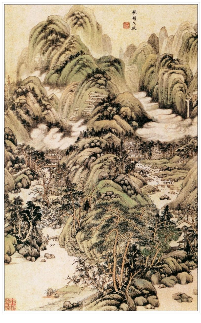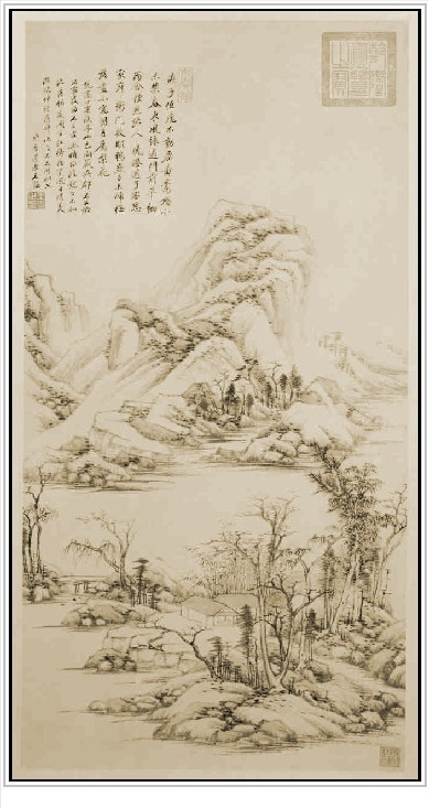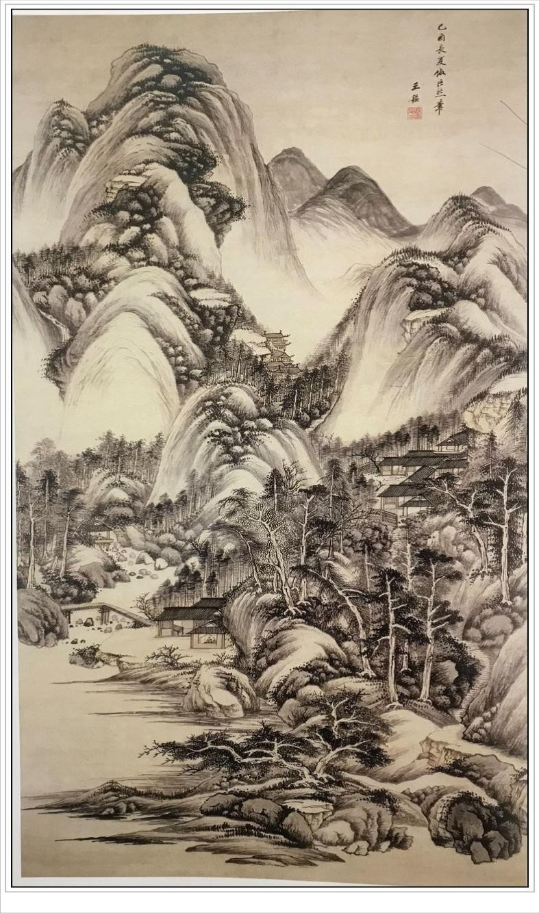 王鉴此图画层层山峦簇拥主峰,苍翠丛林之中,村舍水阁错落,山石用长披麻皴,深得巨然之韵。