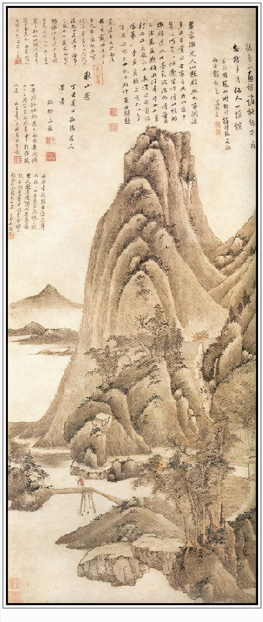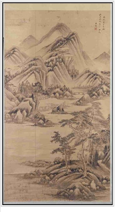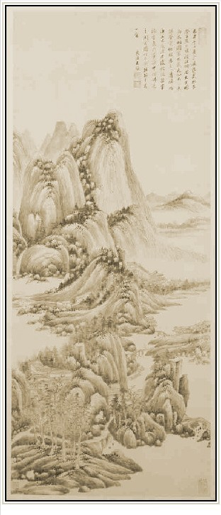 北宋山水画追求的是一种可游可居的景致,用笔用墨都在点滴之间,体现山水为媒的感觉,王鉴模仿元代画家吴镇的这幅《溪山深秀图》也恰到好处地将古人的意境体现得淋漓尽致。在书画收藏大家董其昌收藏吴镇的《溪山深秀图》时,王鉴借来观看了几个月的时间,仿画出了《溪山深秀图》。原来的吴镇的那副《溪山深秀图》就不知下落了。