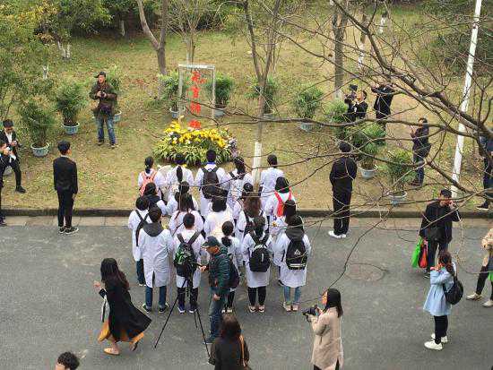 3月17日上午,该校医学院的师生代表和遗体(器官)捐献者的家属以及医学志愿者们,站在纪念碑前,向他们的“无语良师”默哀致敬,并向“无言师碑”献花。