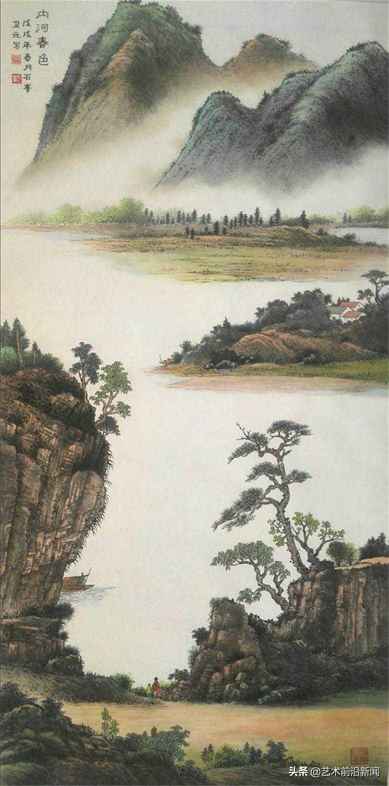 著名山水画巨匠陆俨少曾告诫年轻一代:"早年成名,不见的是好事,成了名,应酬多,妨碍基本功的锻炼,有碍于提高。趁年轻,扎扎实实从艺,踏踏实实做人,切忌名利心太重,要博学众长,冶炉自铸,逐渐形成自己的风格。"贺卫元一定和陆俨少没有谋过面,绘画探索之路也一定没有交集,贺卫元却用自己的艺术实践诠释了一个大众普遍认同的规律——积学厚养、自成面貌。"贺卫元"这个名字在当代画坛有些陌生,他与当代那些推崇备至,耳熟能详的山水画名家相比,可能没有那么早地走进大众的视野,但是,观其作品却深深吸引着笔者,带着强烈的好奇走进贺卫元的山水世界,才发现:他的山水世界干净、纯粹,没有被一切向钱看,寥寥几笔的积习所然,没有一味迎合大众,被市场左右的创作目的所动摇,而是,从艺术的本源挖掘,不忘初心,常年心追手摩于传统书画的艺术滋养之中,在新时代的绘画语境中,立古取新,厚积薄发,形成:色墨交融,雄秀调和,以青山绿水为蓝本的大山大水大世界的艺术风格,堂堂正正、坦坦荡荡,可观、可游、可居,清新自然,气韵古雅,撩人心魄,沁人心脾,让观者流连忘返,回味无穷。