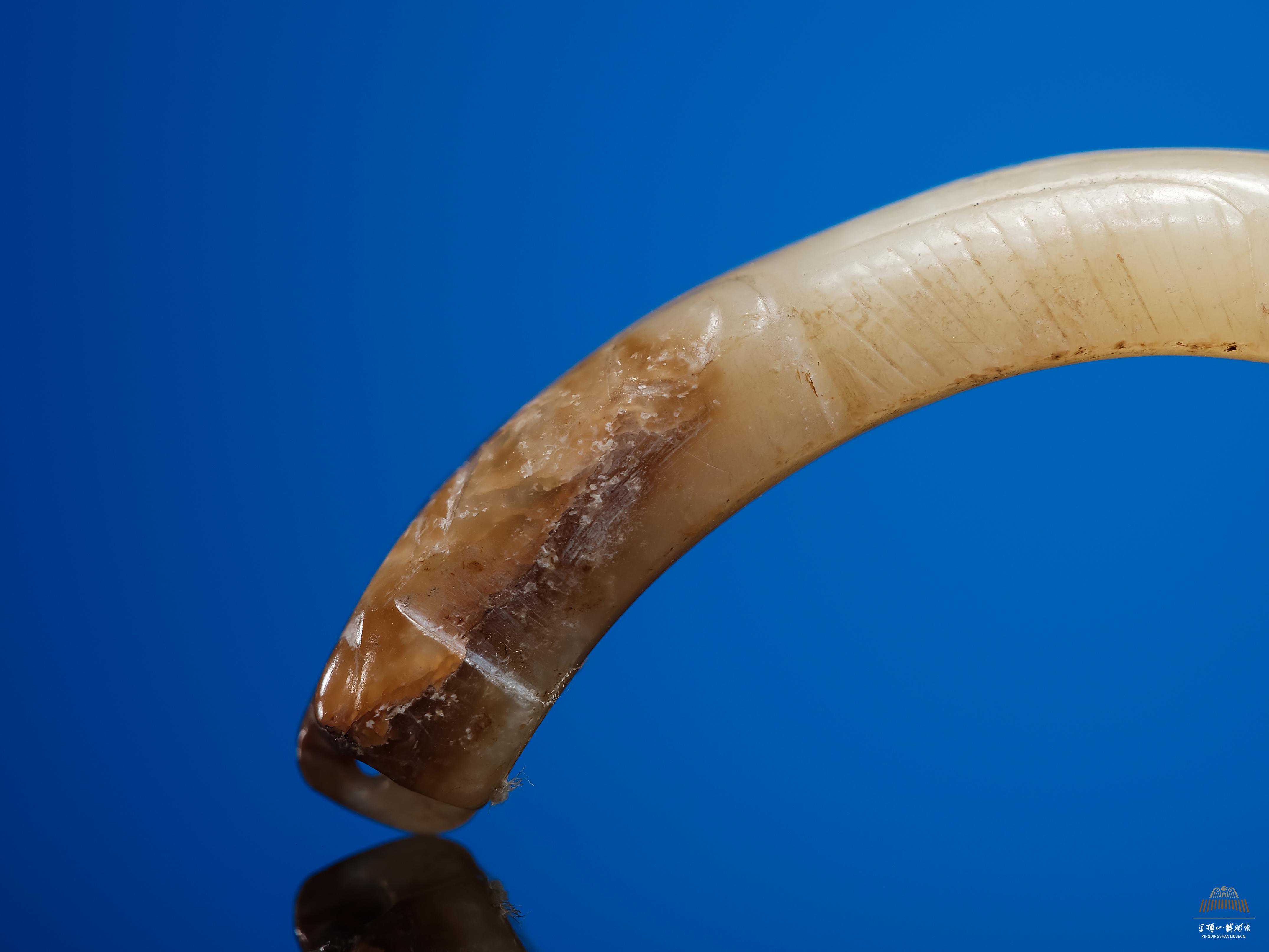 蝉纹玉饰,西周时期佩饰,青玉质,1986年出土于平顶山应国墓地,现藏于平顶山博物馆。玉饰采用整块青玉雕刻,造型古朴别致,一端为蝉头,一端为蝉尾。蝉头有褐色沁,阴线刻画出一双大眼和突出的鼻翼,鼻翼下有穿孔,蝉身窄小成细长拱形,阴线刻划出平行状蝉翼,蝉尾略翘,纹饰虽简单但不乏生动之趣。