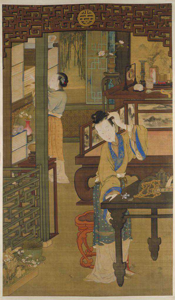 图中精致的家具、富丽的陈设所构筑出的典雅高贵的环境,表明此图表现的是宫廷女子日常生活的景象。梳妆打扮是贵族妇女每日生活中的重要内容之一,对此,她们不敢有丝毫的怠慢。图绘晨起的女子对镜理妆的情景。她为了取得良好的照镜角度,不禁起身而立,双目注视着桌上的铜镜,同时,左手缓缓地往云鬓上插玉簪。情节生动,人物举止自然,显示出作者细致入微的观察力和准确传神的艺术表现力。