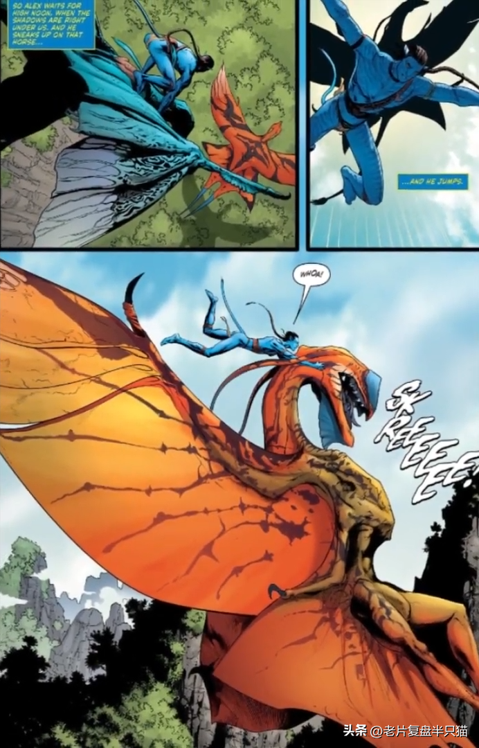 他骑上潘多拉星球最危险的飞禽猛兽——最后的阴影,在纳威人中建立起威信,并集结15个纳威人部族共同对抗天空人的部队。电影中,驯服的镜头只是惊鸿一瞥,而在漫画《阿凡达兄弟》中可以看到更多的细节。
