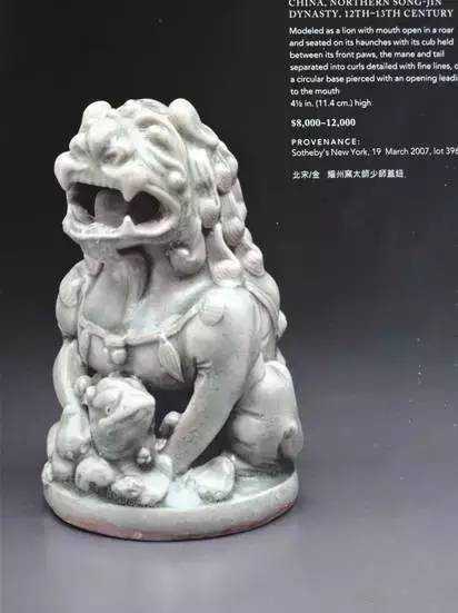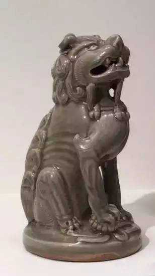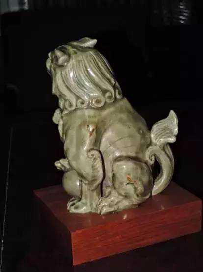耀州窑的三件瓷雕,形象逼真,气势浑厚雄劲,不排除系安思远先生上世纪七八十年代往返于西安收集石鲁画作时所获。尤其“狮子”摆件,外凸的双眸、煽动的鼻孔、龇露的獠牙、挺直的脖颈,在技艺上似乎更胜一筹。而且,獅子后脑的鬛毛、颈间的项圈、翘起的尾巴、雄健的爪子和趾骨的分明,则精工细琢至无以复加地步,为存世作品中仅见。可能基于这些原因,安思远才为这件原本属建筑物上的构件,配置了木座,俨然成了摆件。该瓷塑经上手,感觉到体量颇重;浅灰色的胎,质地细腻;器身釉薄或缩釉处,无不显露出“姜黄釉”色斑。这些特征,不单说明生产年代为宋,还证明其出生地当为铜川黄堡镇。宋时,耀州窑青瓷名闻遐迩,河南、广东、广西诸多窑场都有仿制,“并且作为外销瓷输往亚、非各国。”