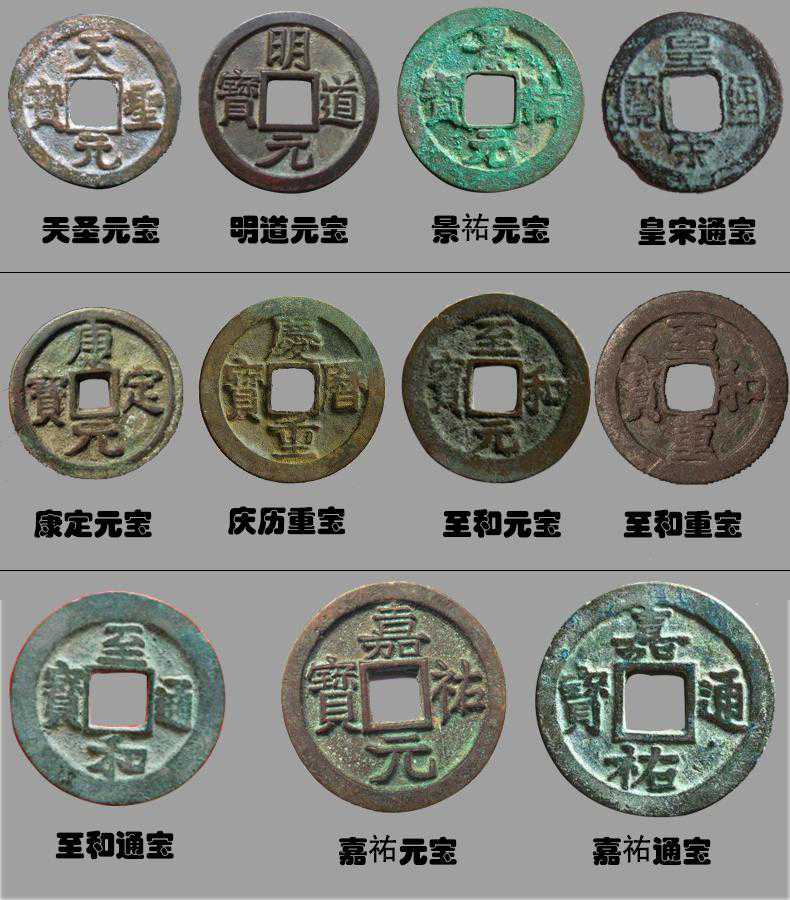 公元1022年,赵恒之子赵祯即位,改年号为"天圣",于是就出现了"天圣元宝"。相比于他的父亲赵恒,赵祯使用的年号更多,有"明道"、"景祐"、"宝元"、"康定"、"庆历"、"皇祐"、"至和"、"嘉祐",所以他铸造发行的钱币也多,有"明道元宝"(1032年)、"景祐元宝"(1034)、"皇宋通宝"(1039年,非年号钱)、"康定元宝"(1040年)、"庆历重宝"(1041年)、"至和元宝"(1054年)、"至和重宝"(1054年)、"至和通宝"(1054年)、"嘉祐元宝"(1056年)、"嘉祐通宝"(1056年)等。